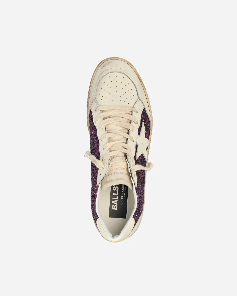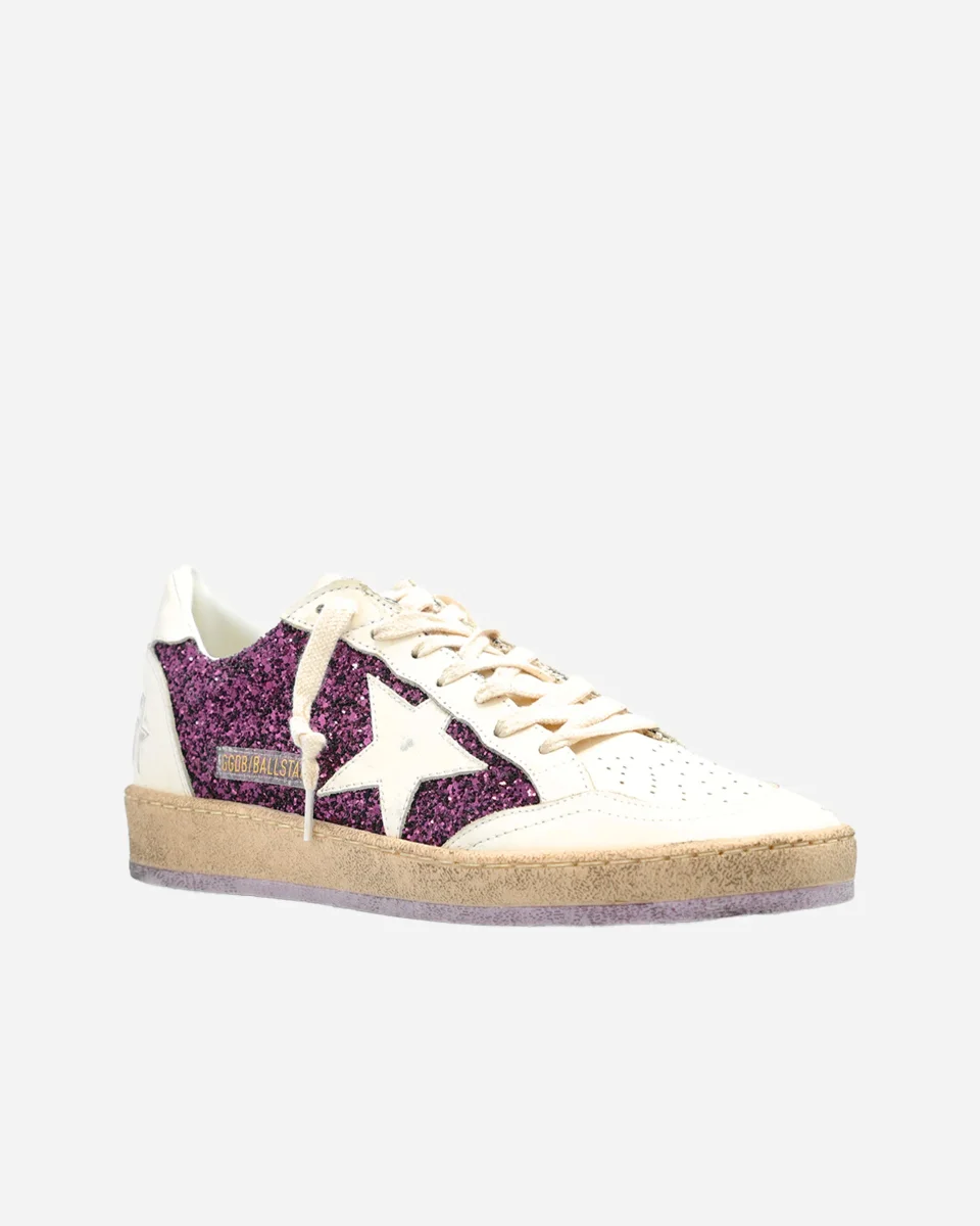 Baskets, Golden Goose, Ball Star, paillettes violettes, étoile emblématique, cuir, lettrage SNEAKERS, vintage urbain, luxe italien