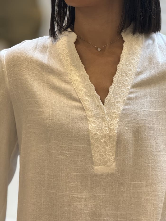 - Blouse à ml – col v dentelle + bout des manches