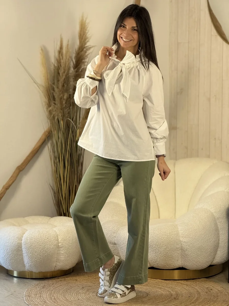 Blouse à ml – col haut Grand nœud au col Manche chauve souris Taille : Justine mesure 1m69. Elle porte la taille S pour ce modèle. Taille : S (36) / M (38) / L (40) Composition & entretien : 100% COTON Lavage à la main conseillé Besoin d’un conseil ? Consultez notre foire aux […]