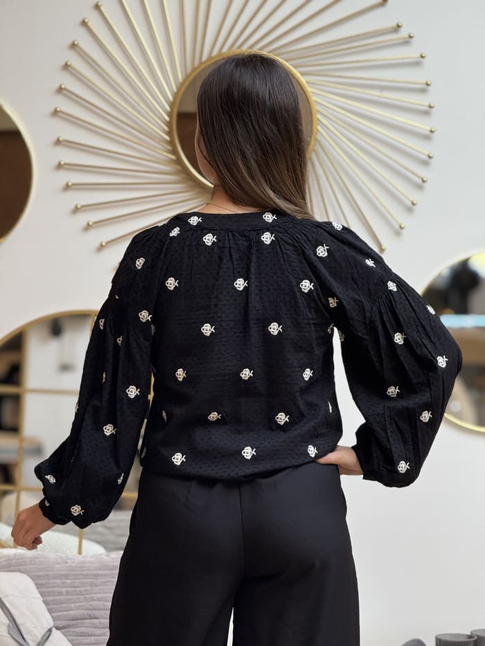- Blouse à manches longues fleurs bleu marine brodée