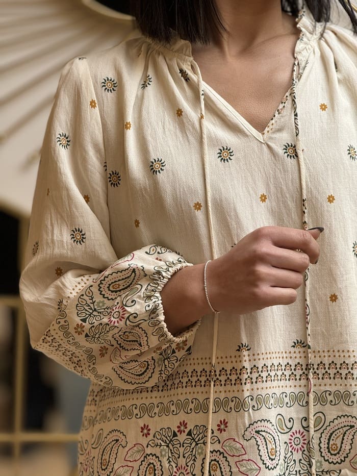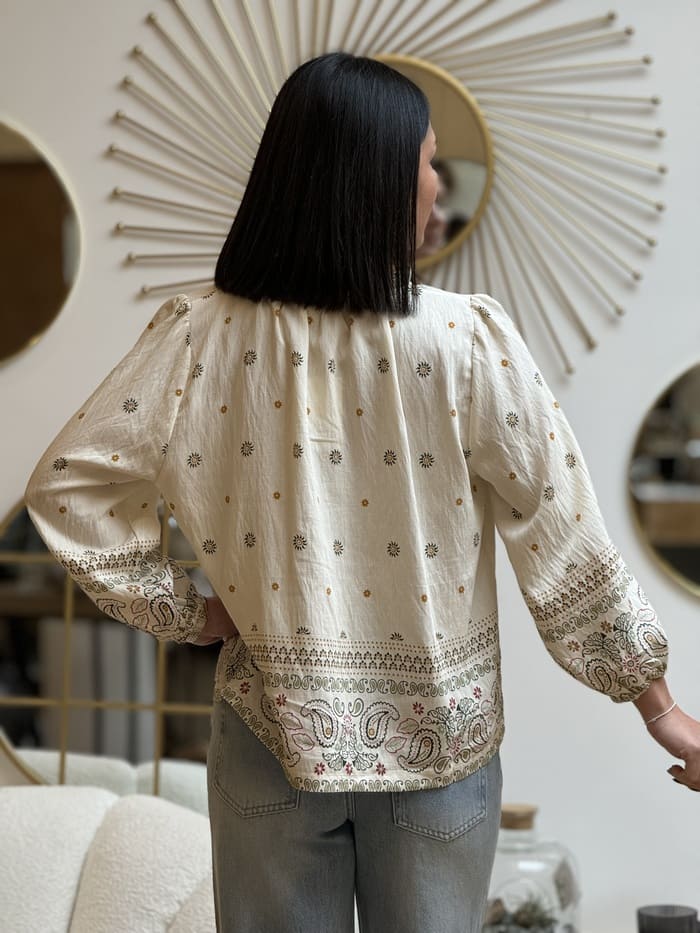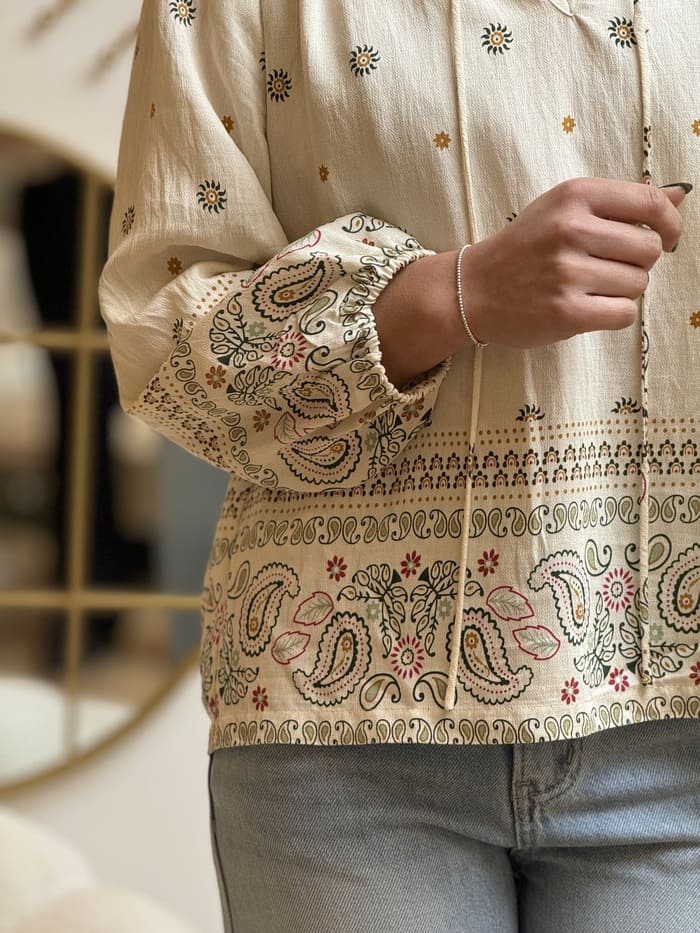 • BLOUSE à ml col avec lien imprimé fleurs et formes