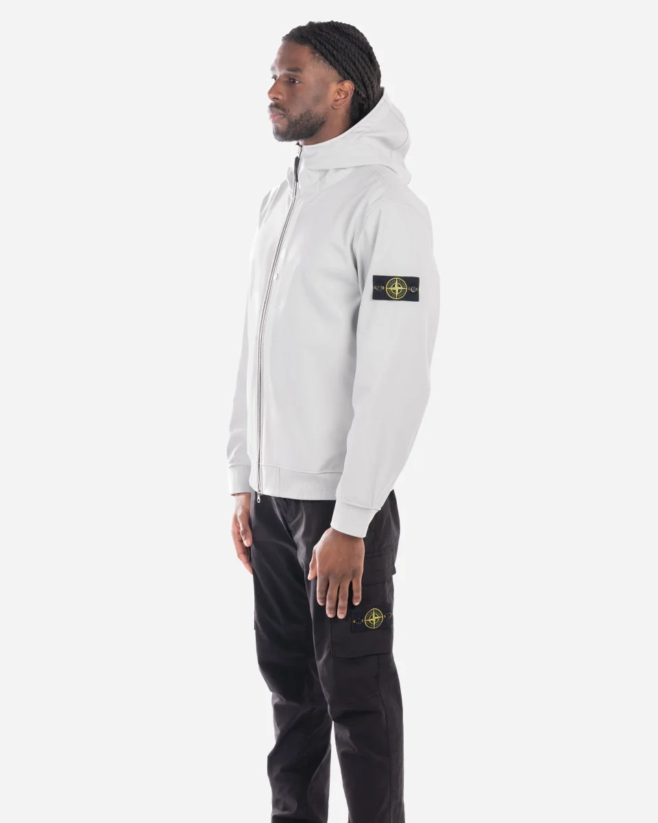 Blouson, capuche, Stone Island, Soft Shell-R, e.dye, technologie sans eau, membrane respirante, résistant eau vent, doublure polaire, fermeture bidirectionnelle, œillets ventilation.