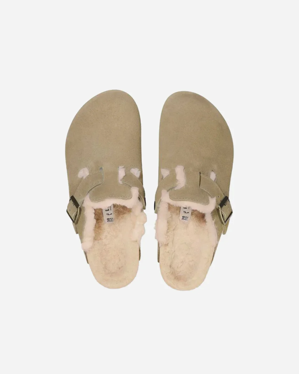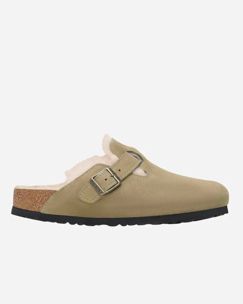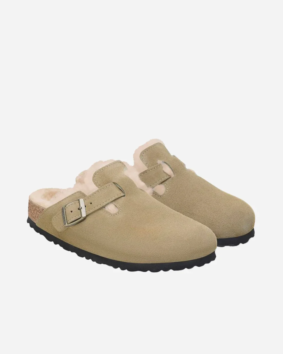 L’originalité avant tout ! Le sabot Boston, un classique parmi les modèles BIRKENSTOCK, se présente ici dans une version particulièrement douillette en véritable cuir velours de qualité supérieure. La semelle de propreté en fourrure d’agneau naturelle et les brides doublées de fourrure d’agneau lui donnent du style et gardent vos pieds bien au chaud. La chaussure idéale pour les soirées d’hiver au coin du feu !
