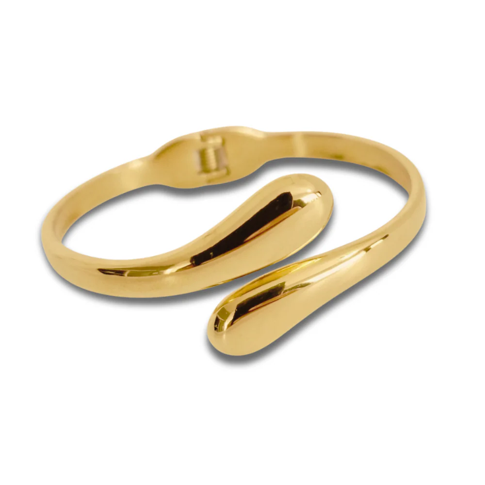 Design fluide : Forme ouverte avec des extrémités courbées en goutte. Finition dorée : Métal poli offrant un éclat luxueux et sophistiqué. Style minimaliste : Élégant et polyvalent, parfait pour sublimer toute tenue.