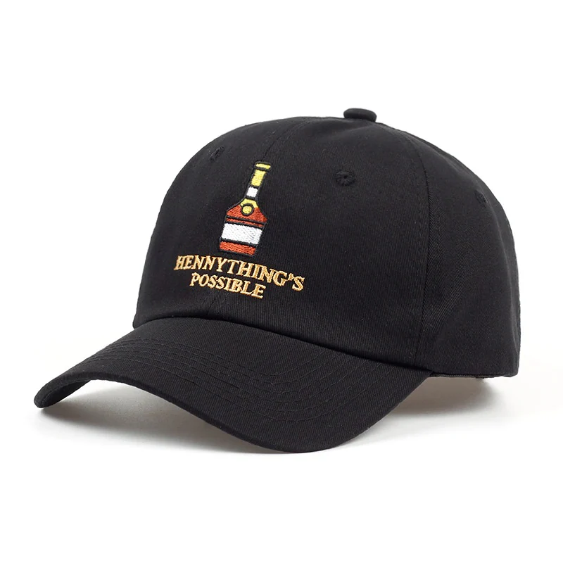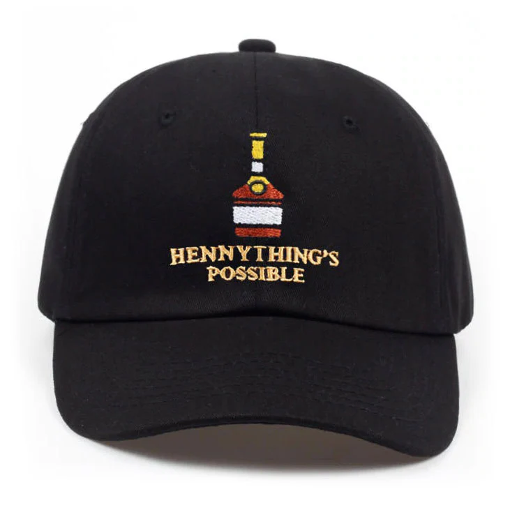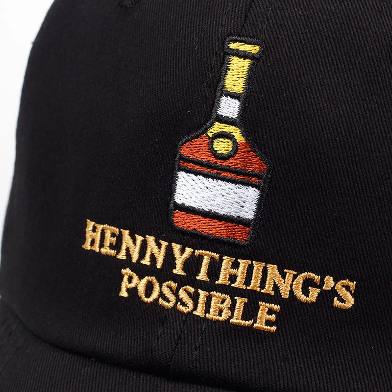 Déclinée en trois coloris, dont le noir et le blanc, cette casquette se marie avec presque tout. La version bordeaux quant à elle se démarque par son côté légèrement sophistiqué. Dotées de coutures discrètes et un bouton sur le top, cet article est parfaitement solide. Une bouteille et l’inscription « Henny thing’s possible » sont brodées sur le devant pour personnaliser son allure. Tu comprendras le jeu de mot..