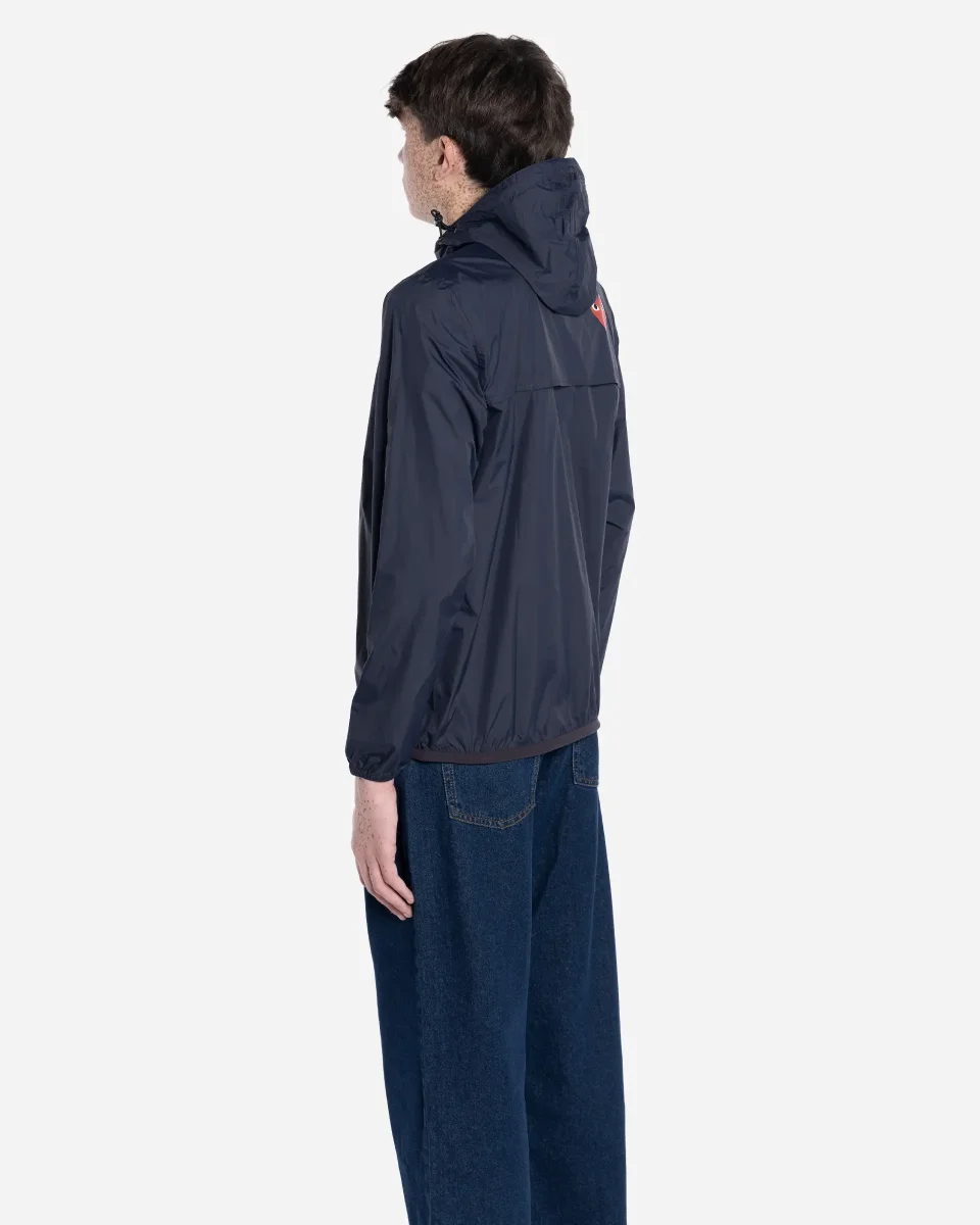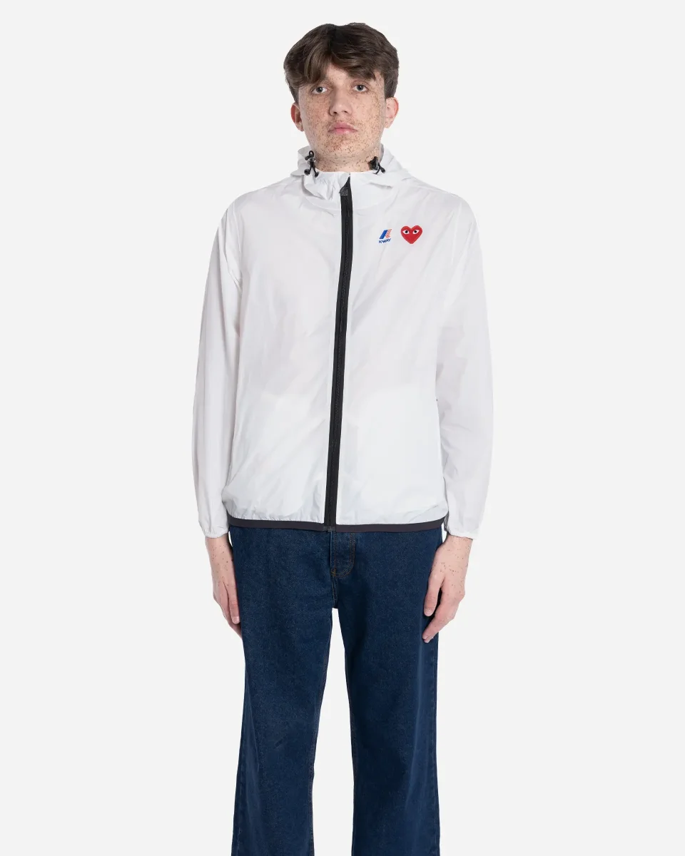 Collaboration K Way x CDG Play : Veste zippée imperméable avec une poche kangourou, une coupe droite et des cordons élastiques autour du cou et de la taille.