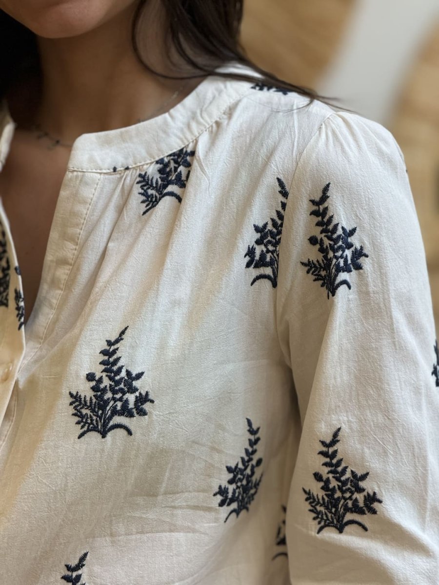 • CHEMISE COL ROND – MOTIF BLEU FEUILLAGE