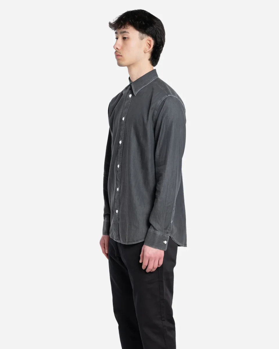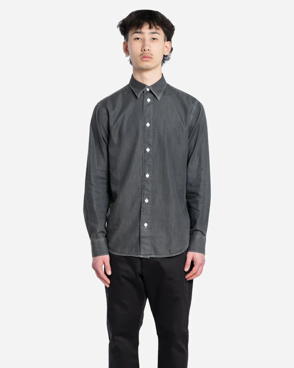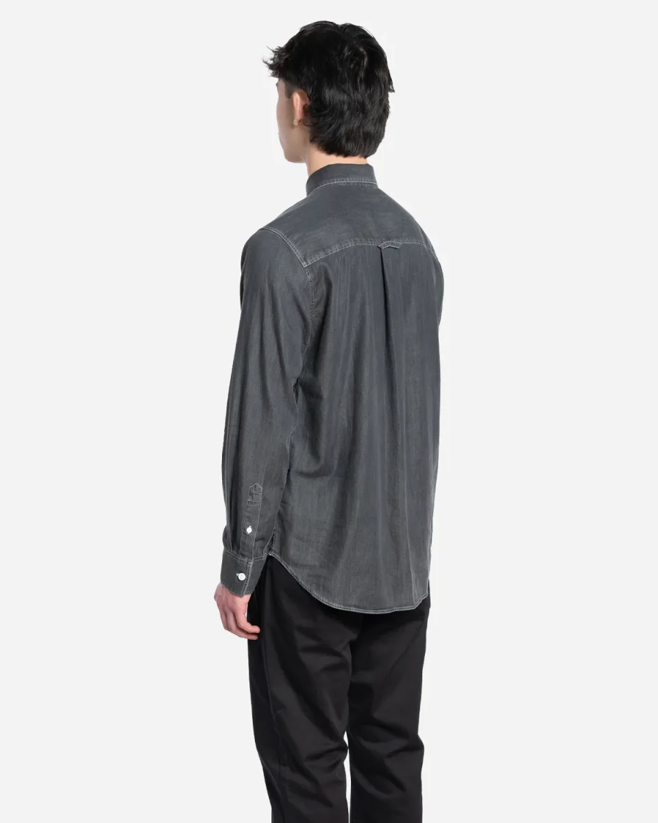 Chemise en jean décontractée confectionnée en sergé de coton biologique égyptien doux, dotée de boutons en nacre, d’une large patte de boutonnage et d’un grand col.