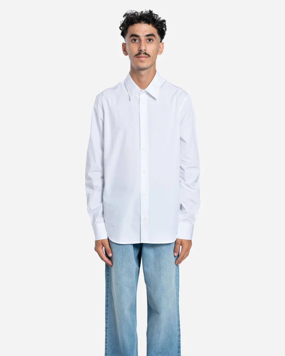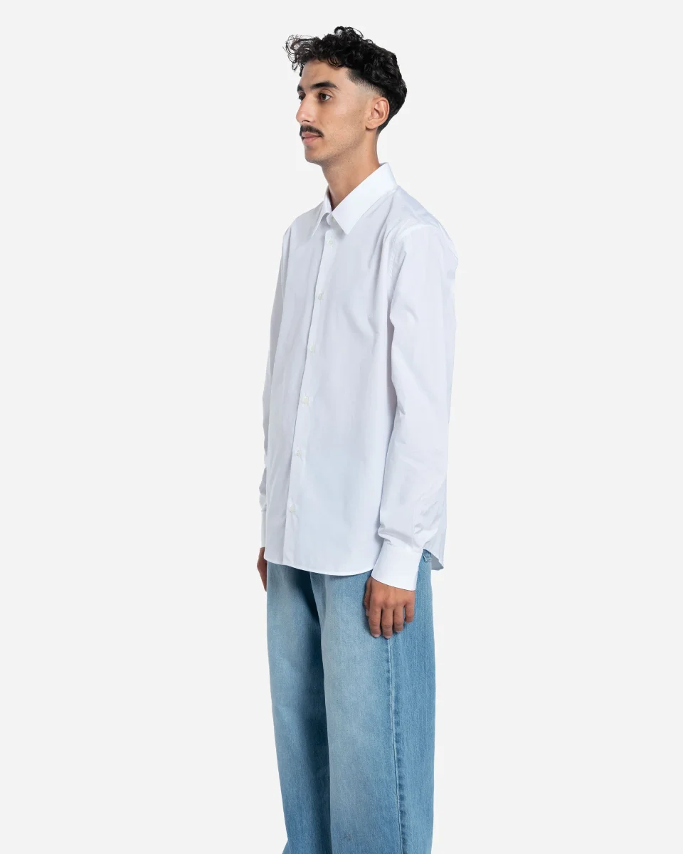 Chemise blanche AMI en popeline de coton, avec une coupe droite et un col classique. Fermeture par boutons nacre et logo Ami de Coeur embossé discrètement dans le dos. Un essentiel élégant et facile à porter.