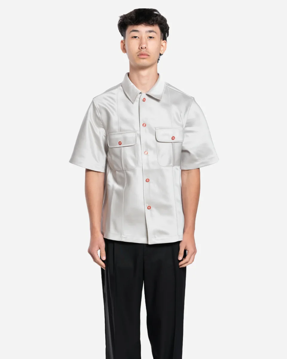 Chemise, satin, duchesse, manches courtes, fermeture à boutons, boutons plats en émail rouge, col pointu, couture nervurée, fentes latérales, poches poitrine