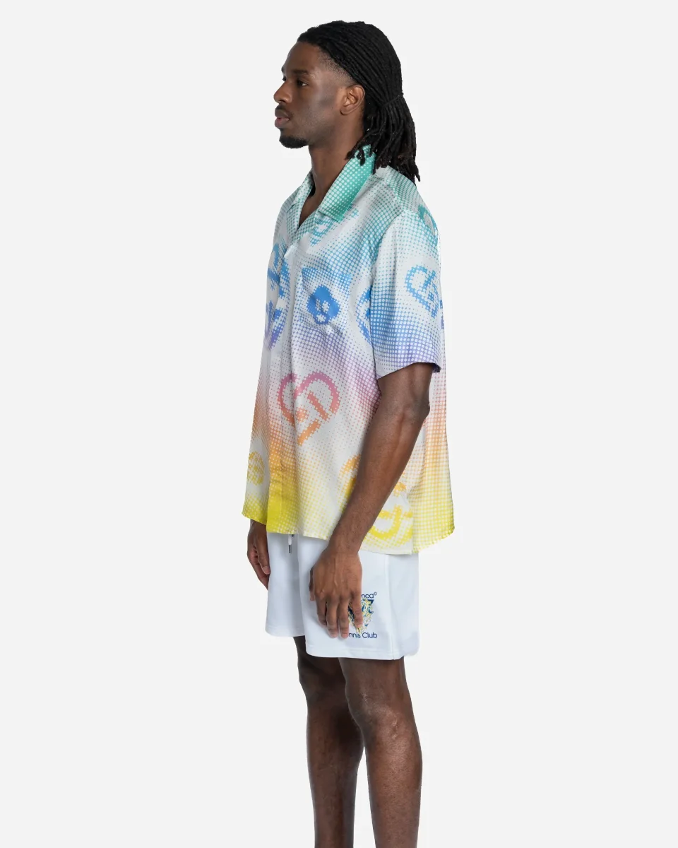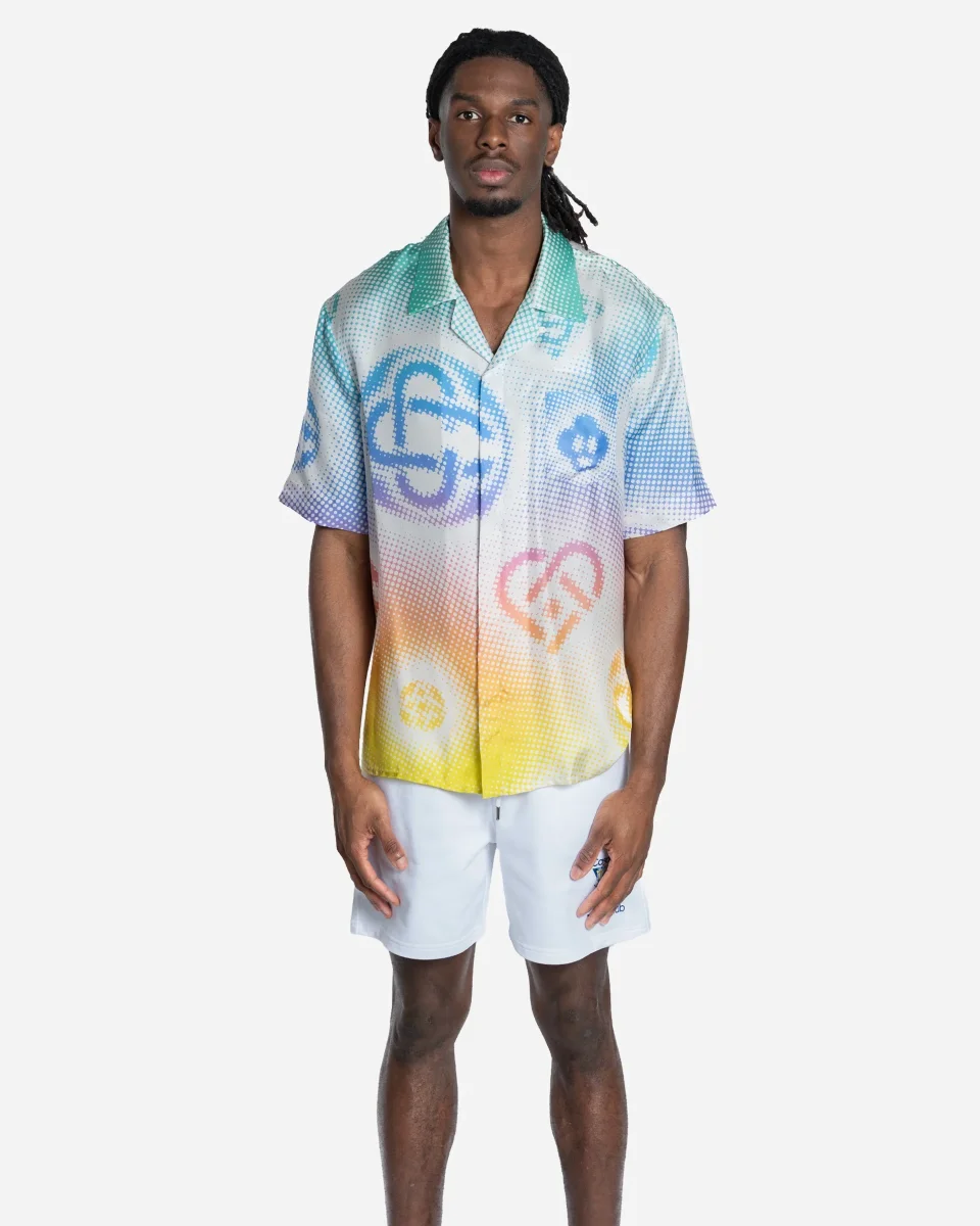 Cette chemise à manches courtes, nommée Halftone Logo, arbore un imprimé intégral mettant en scène les monogrammes de la maison revisités par une technique d’aérographie. Confectionnée en Italie dans un twill de soie luxueux, elle se distingue par ses jeux de couleurs en dégradé et son motif en demi-teinte. Le design est complété par un col cubain classique, une poche poitrine et une fermeture boutonnée ornée de boutons en corozo gravés du logo CC entrelacé. Sa coupe décontractée en fait une pièce forte et artistique pour la saison.