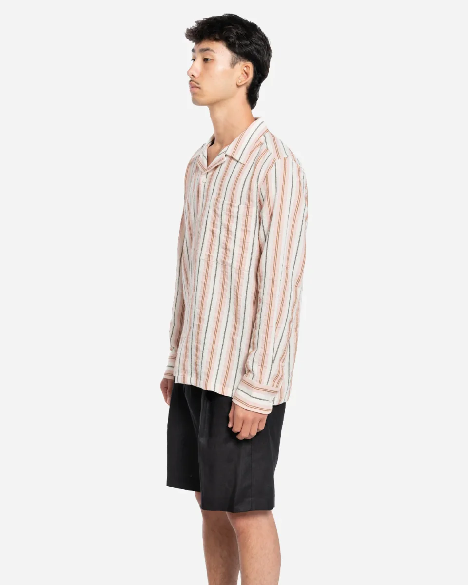 Chemise à col ouvert, confectionnée dans un mélange de coton et lin tissé teinte fil avec motif rayé type panier. Coupe regular fit, dotée d’une poche poitrine discrète. Un basique d’été léger et travaillé.