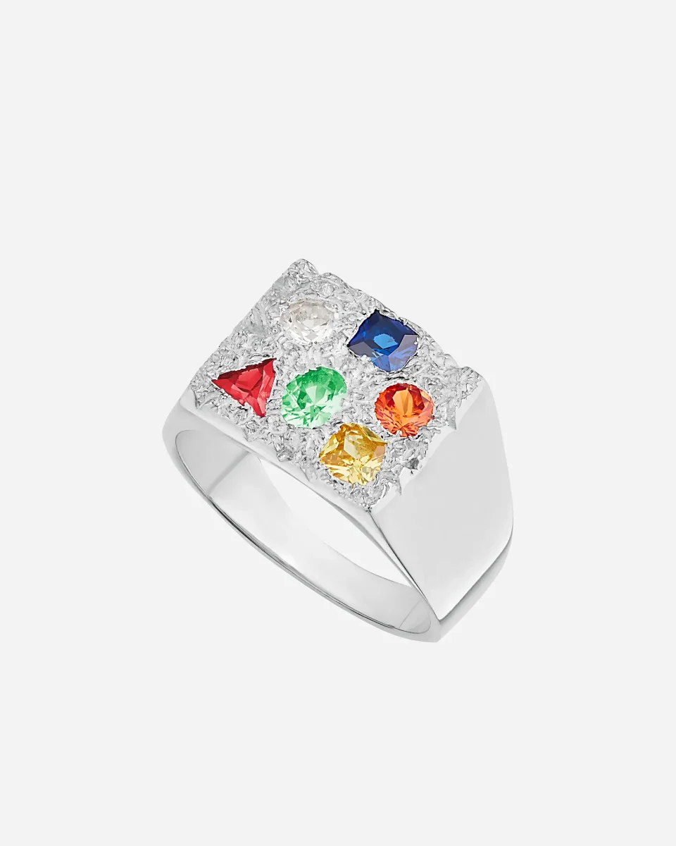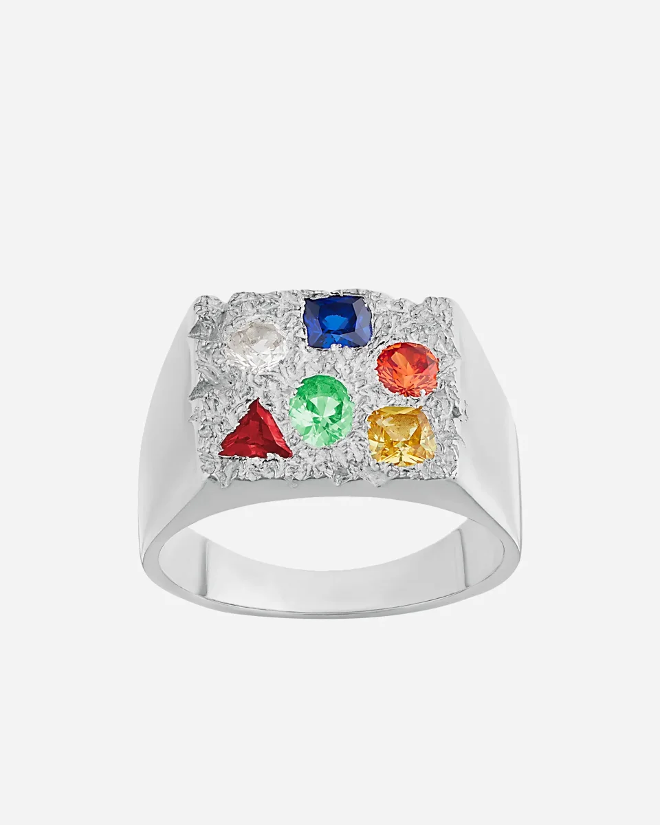 Bague chevalière, argent sterling recyclé, artisanale, Londres, saphirs multicolores, formes variées, poinçon britannique, design unique, bijouterie haut de gamme