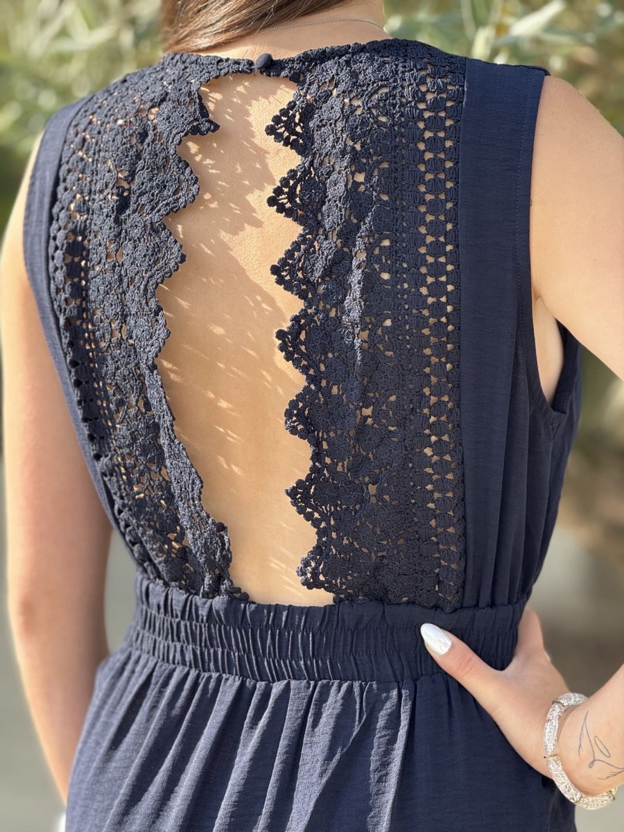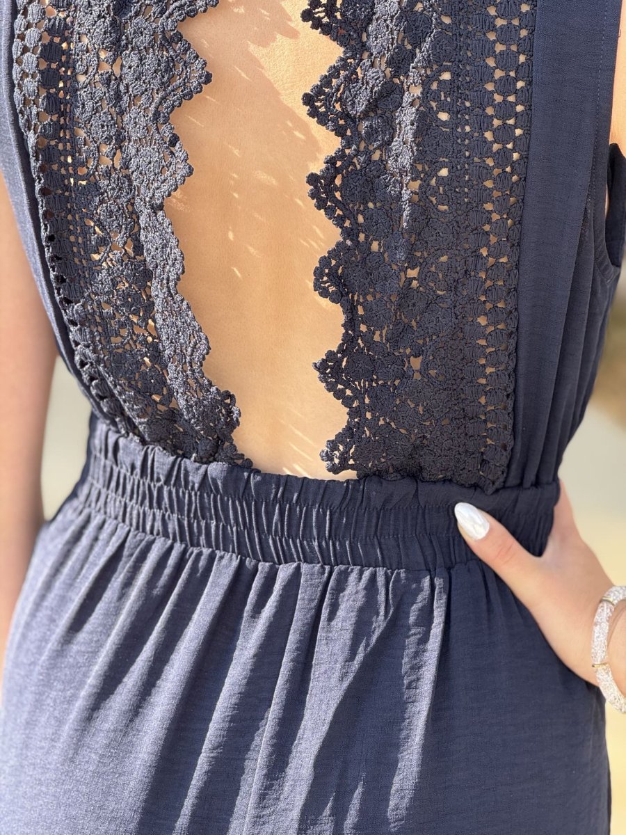 - Combipantalon col v grosse bretelle dentelle de fleur dans le dos