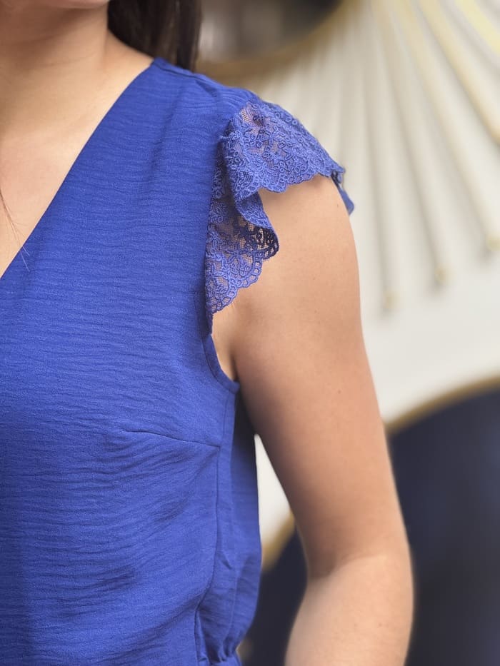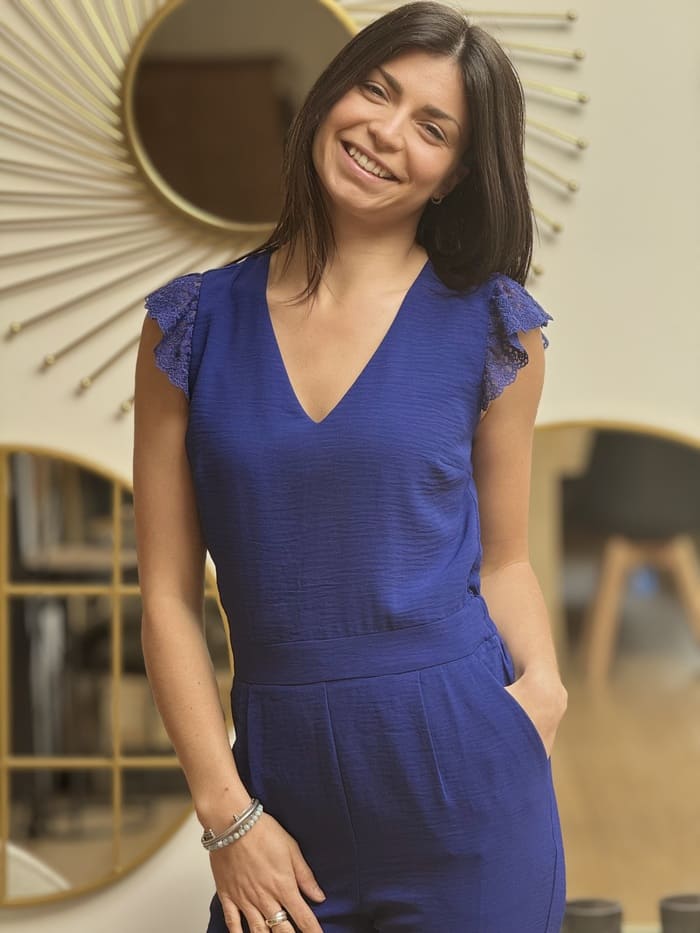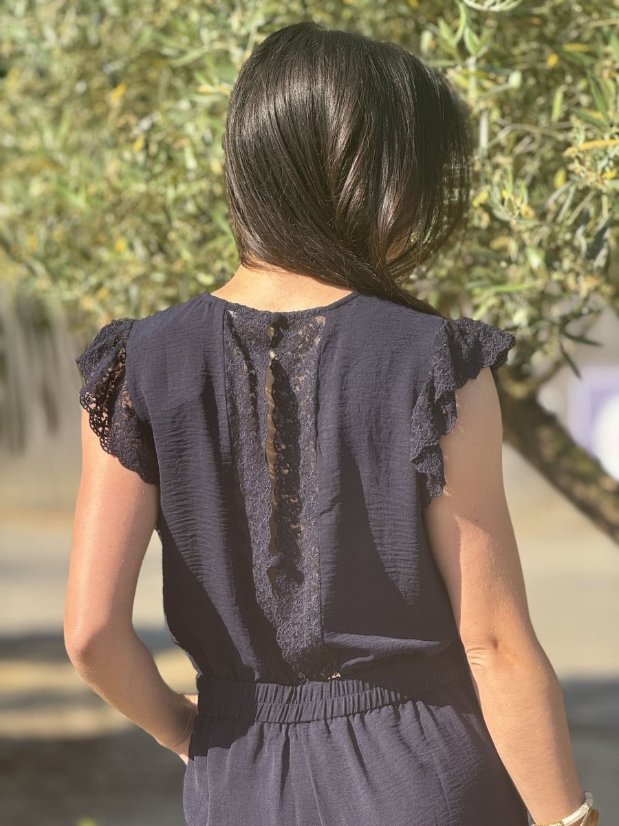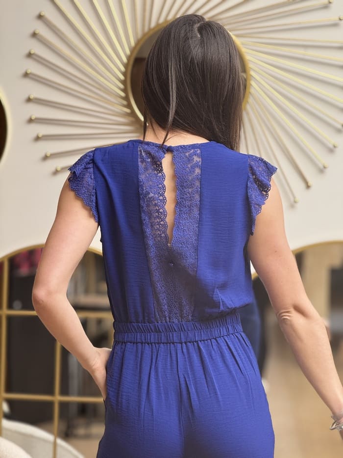 - Combipantalon à mc en dentelle col v – avec 2 poches – dos ouvert dentelle