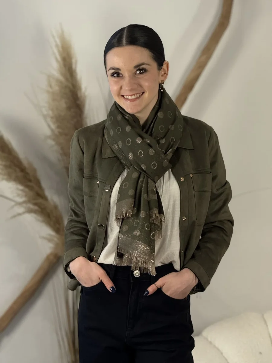 ECHARPE FRANGES IMPRIMÉE GRANS CERCLES PAILLETTÉE Taille : Mathilde mesure 1m65. Elle porte la taille Taille unique pour ce modèle. Taille : Taille unique Composition & entretien : ATTENTE Lavage à la main conseillé Besoin d’un conseil ? Consultez notre foire aux questions ou contactez-nous via notre formulaire de contact