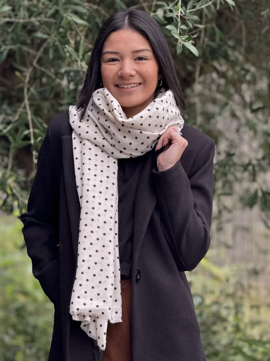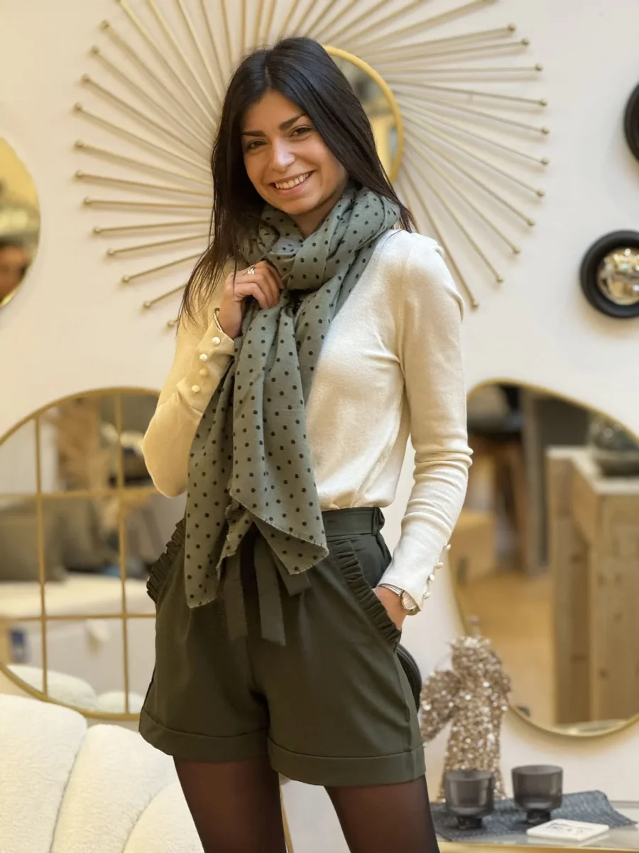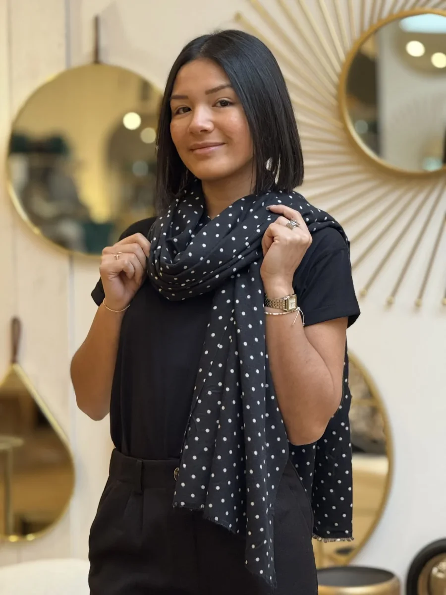 FOULARD PETITS POIS Taille : Justine mesure 1m69. Elle porte la taille unique pour ce modèle. Taille : Taille unique Composition & entretien : 100% POLYESTER Lavage à la main conseillé Besoin d’un conseil ? Consultez notre foire aux questions ou contactez-nous via notre formulaire de contact