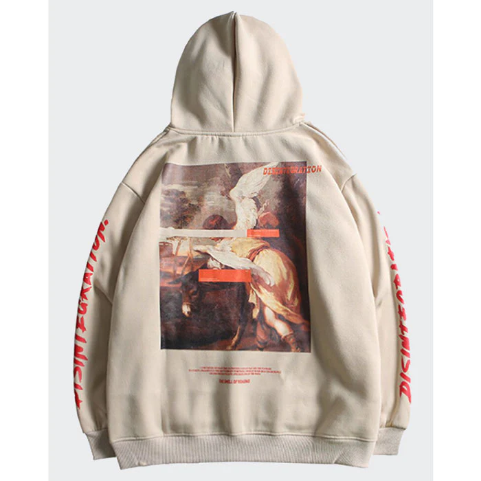Ce sweat à capuche est idéal en tant que vêtement ample et surdimensionné (oversize) et fait partie de notre gamme » Disintegration « . Un hoodie qui couple le style à l’art avec la représentation d’une peinture à l’huile en son dos.