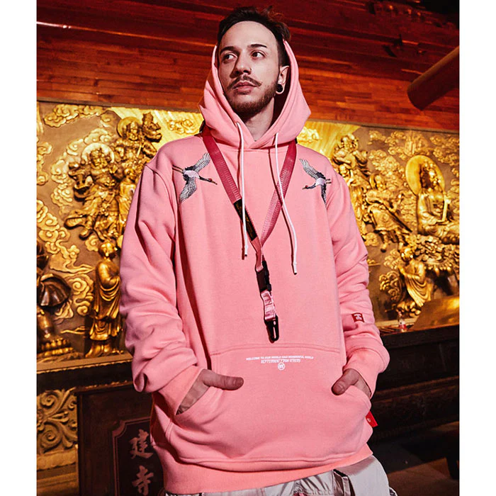Fabriqué en mélange de coton et polyester, ce pull possède une étoffe aux mailles assez serrées pour te tenir bien au chaud. Sa coupe simpliste met en valeur ses imprimés dans le dos. Pour l’agrémenter, ce sweat à capuche est agrémenté de deux oiseaux brodés sur le devant dans un style graphique chinois. Le pull est proposé dans une couleur rose pâle très féminin, mais les hommes aussi pourront l’utiliser pour réaliser une tenue qui sort du lot.