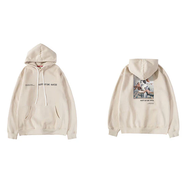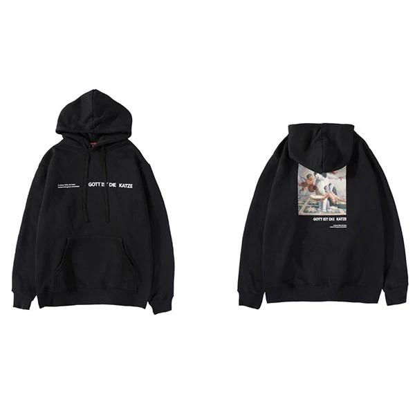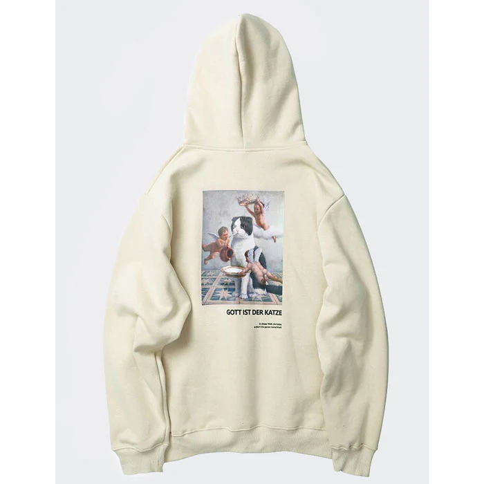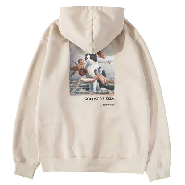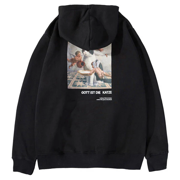 Le sweat à capuche Sutekina est une magnifique pièce de streetwear, il représente un chat traité comme un dieu par des petits anges qui lui servent une assiette de lait et un des anges lui met une couronne sur la tête en son honneur. Le texte en allemand signifie « Dieu est le chat ». C’est une petite oeuvre d’art que tu pourras porter durant toutes les saisons, il te tiendra chaud en hiver et sera utile en été pour les débuts de soirée. Un hoodie de qualité que tu peux ajouter les yeux fermé à ta collection streetwear.