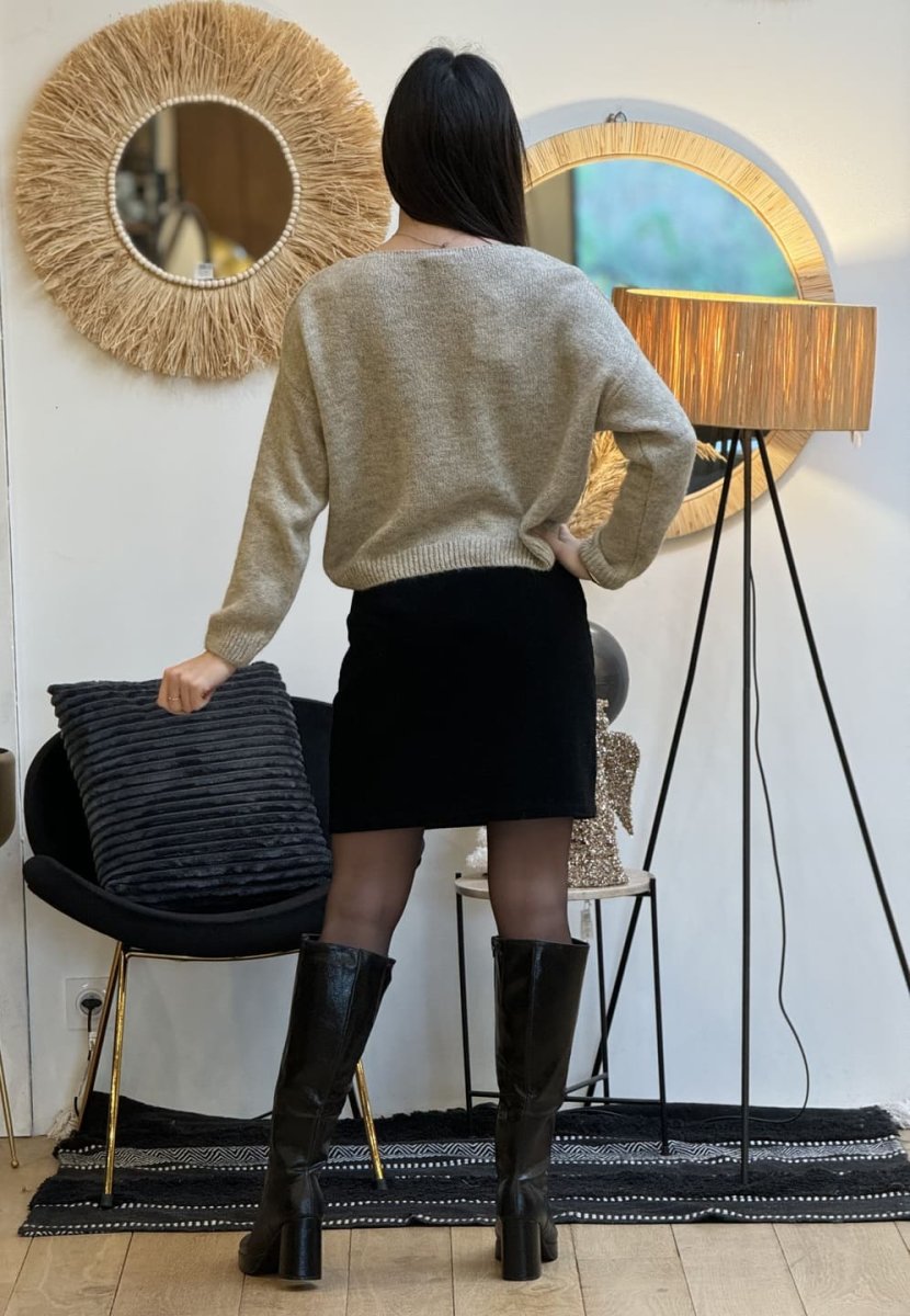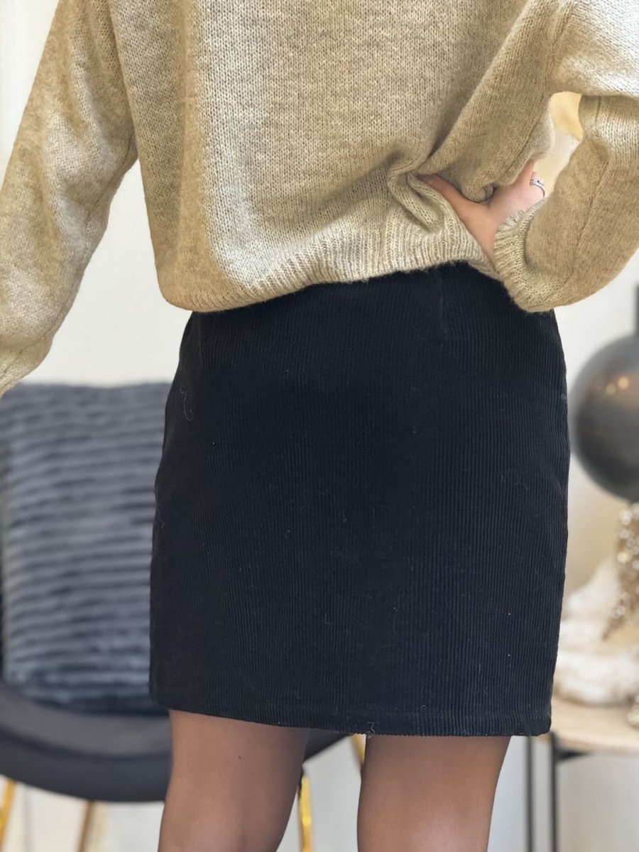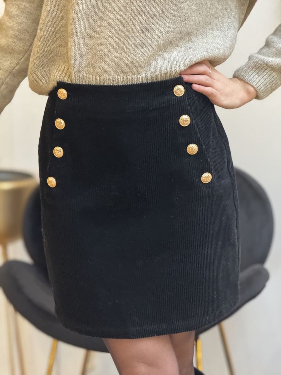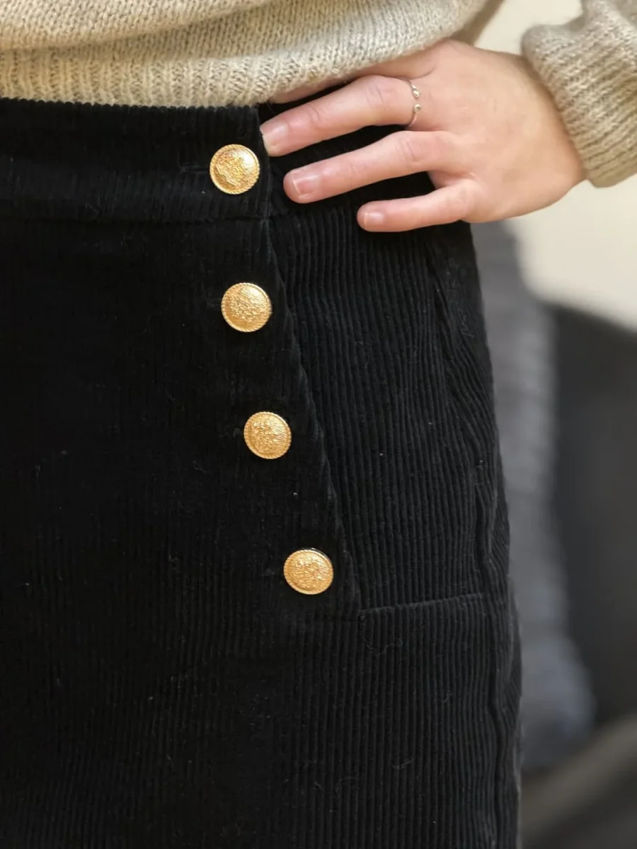 • JUPE COURTE VELOURS CÔTELÉ – BOUTON SUR LE CÔTÉ