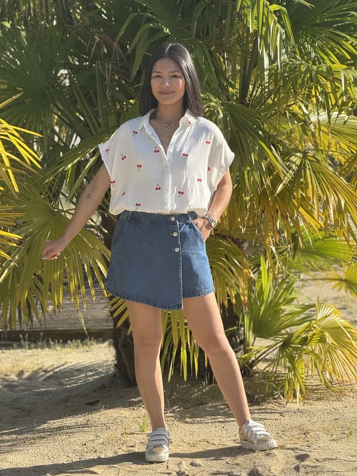 JUPE COURTE EN JEAN AVEC 3 BOUTONS Taille : Mathilde mesure 1m68. Elle porte la taille S/M pour le modèle noir. Taille : S/M (36-38) et M/L (38-40) Composition & entretien : 100% COTON Lavage à la main conseillé Besoin d’un conseil ? Consultez notre foire aux questions ou contactez-nous via notre formulaire de contact