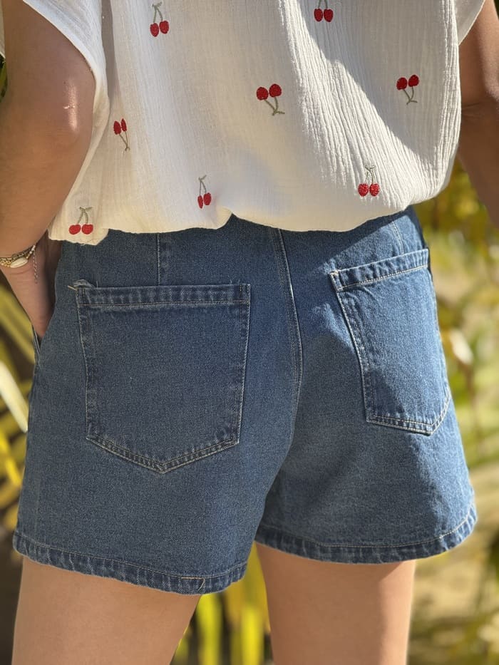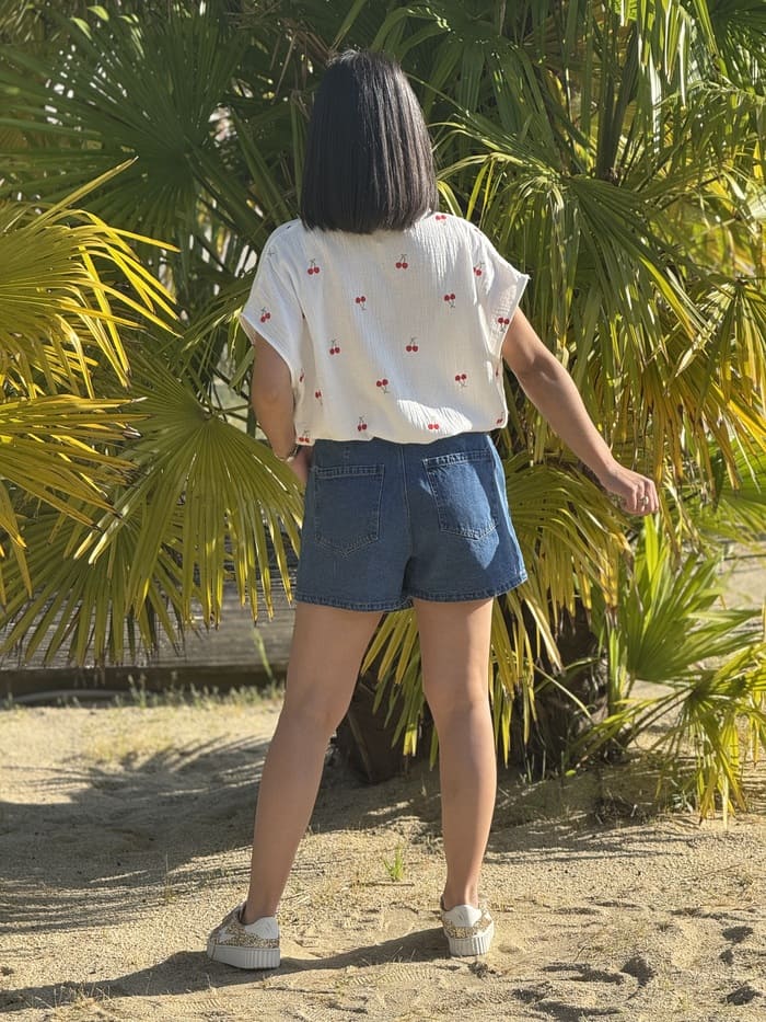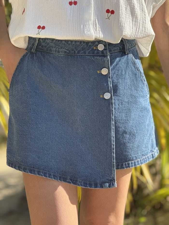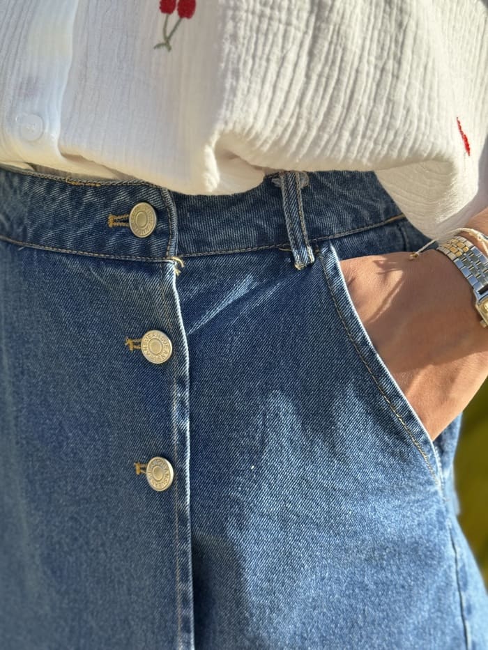 • JUPE COURTE EN JEAN AVEC 3 BOUTONS