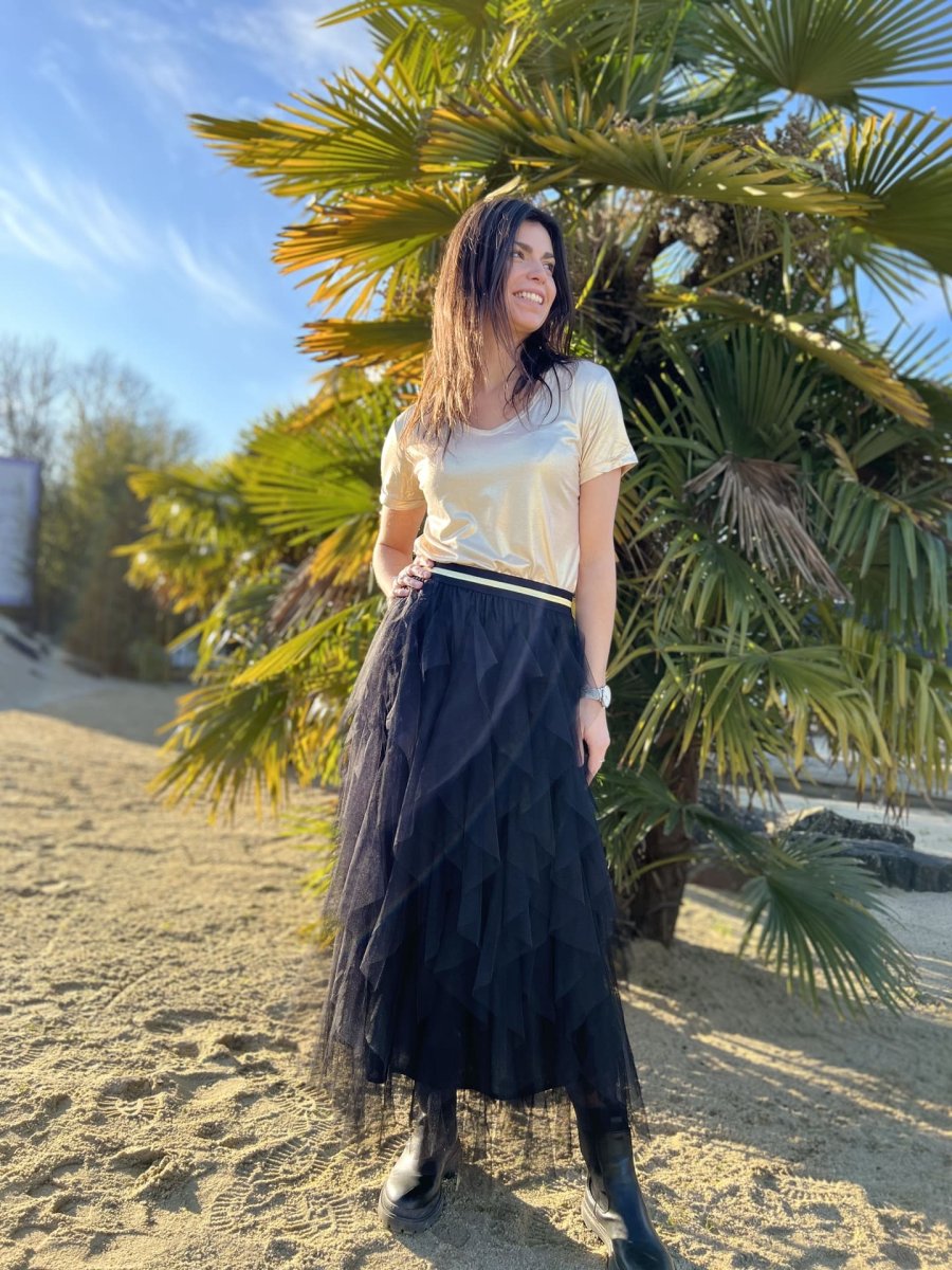 Jupe longue tulle froufrou Ceinture élastique noir et doré Taille : Justine mesure 1m69 et Mathilde mesure 1m65. Elles portent la taille Taille unique pour ce modèle. Taille : Taille unique Convient de la taille 36 à 42 Composition & entretien : 100% viscose Lavage à la main conseillé Besoin d’un conseil ? Consultez notre […]