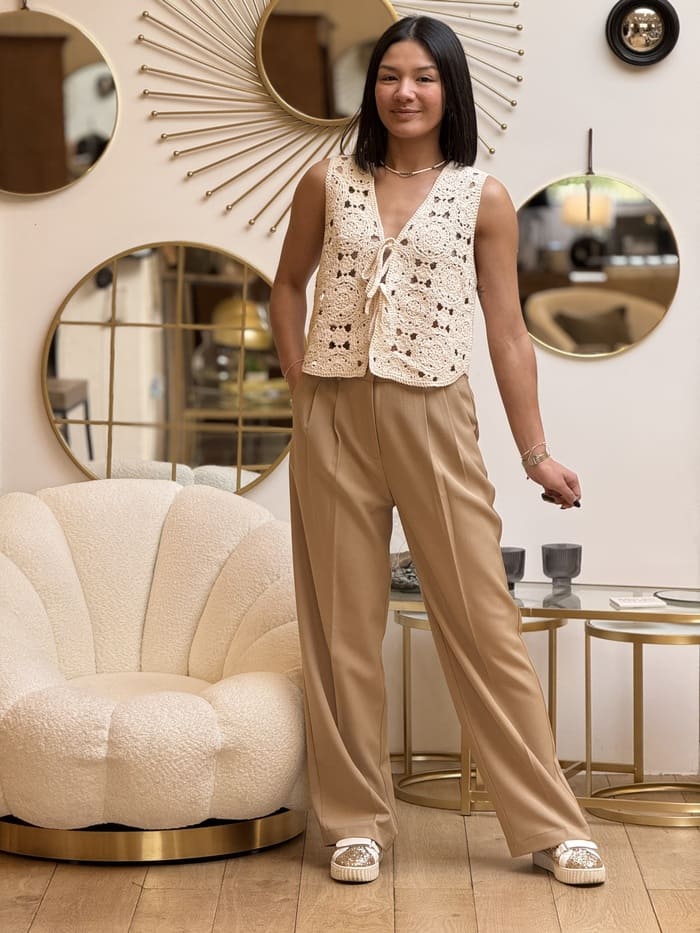Mathilde mesure 1m65. Elle porte la taille S (36) pour ce modèle.