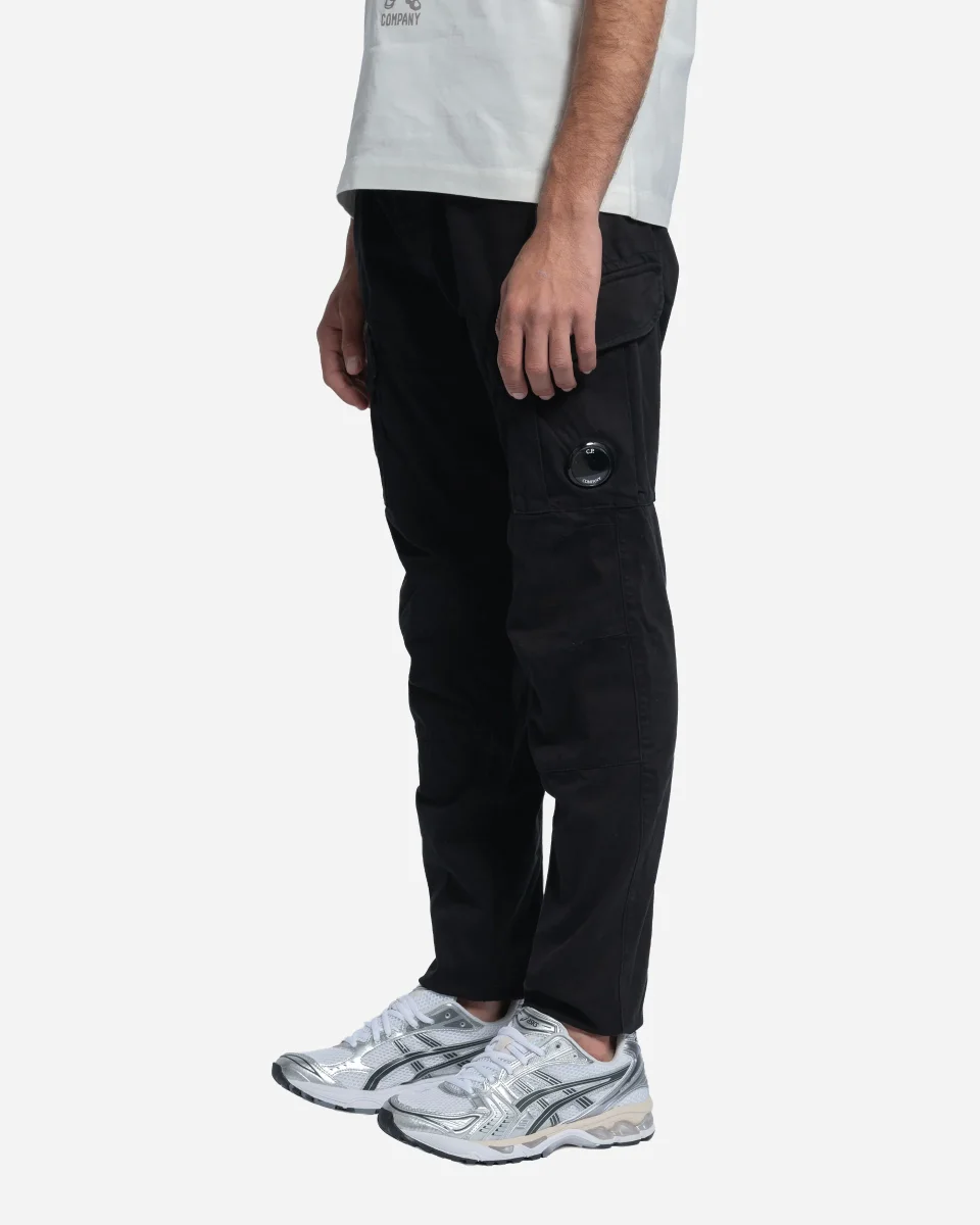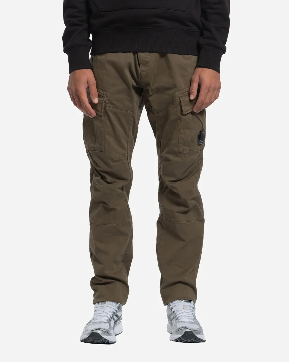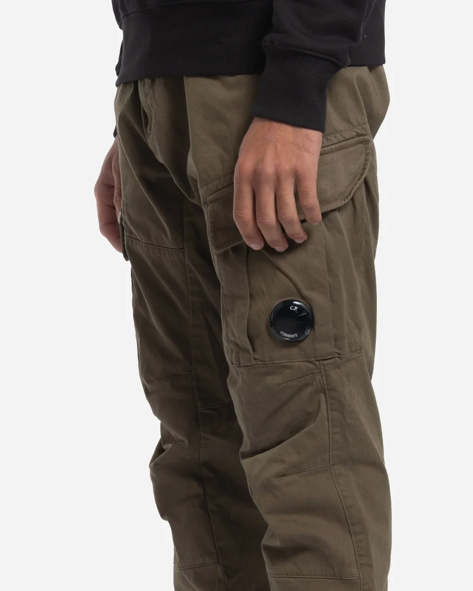 Pantalon, cargo, C.P. Company, coton stretch, lentille emblématique, coupe ergonomique, fermeture boutons glissière, passants ceinture, poches cargo, teint en pièce, étiquette appliquée.