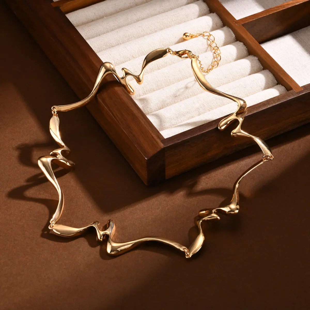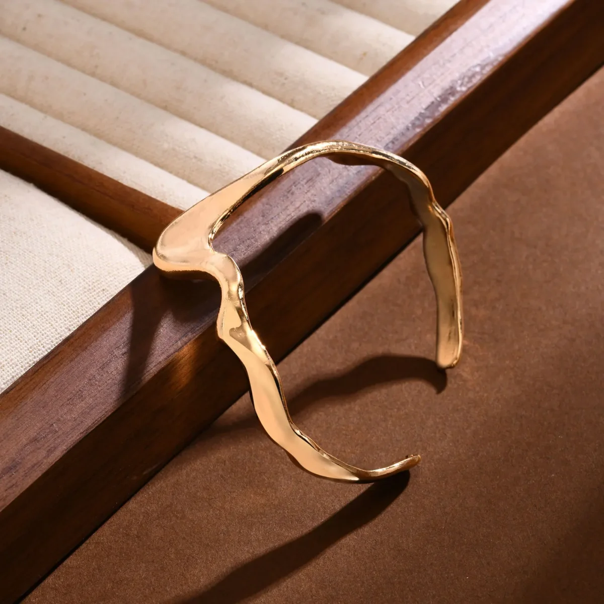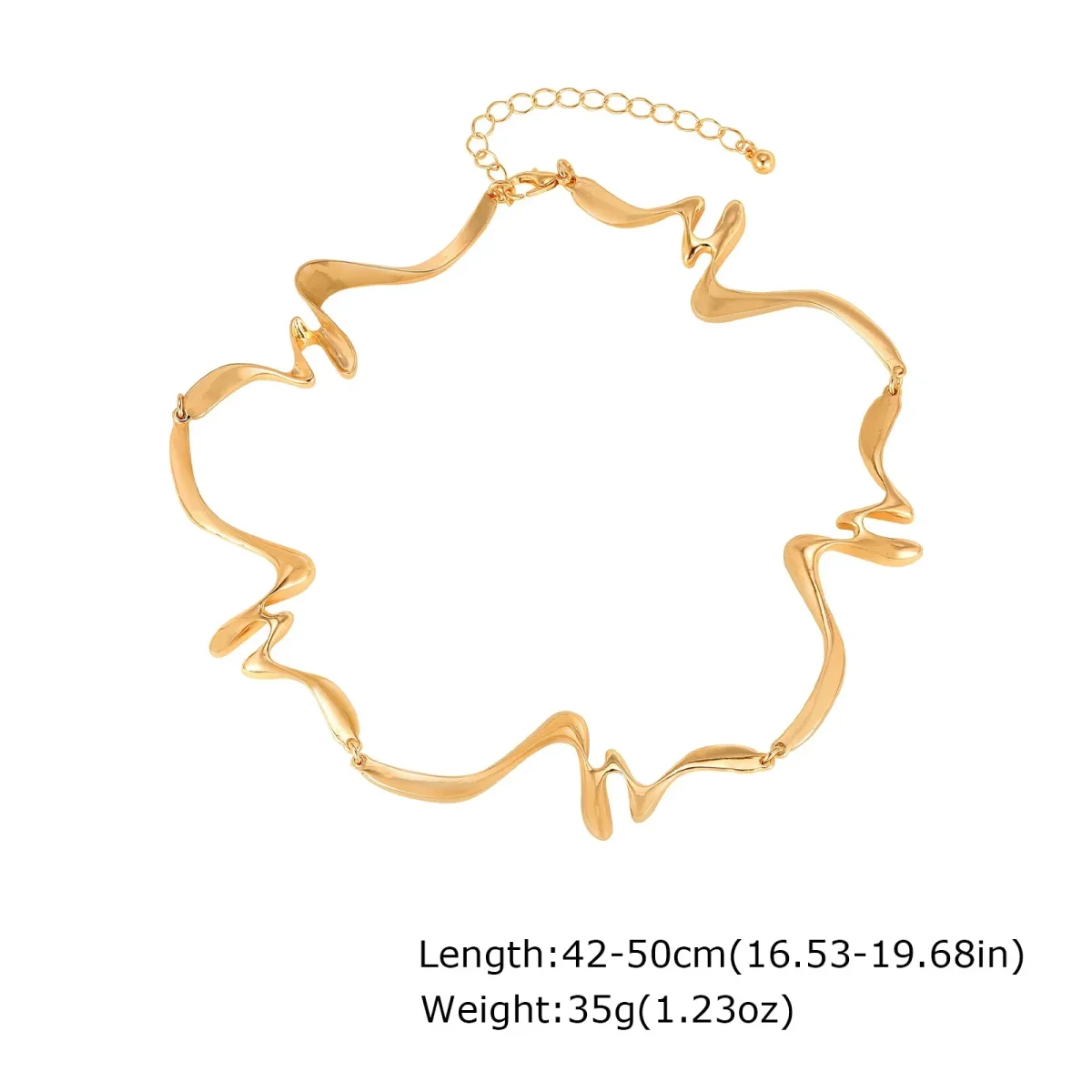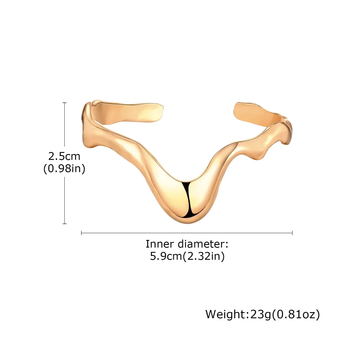 Design sculptural : Lignes fluides et asymétriques rappelant un mouvement naturel. Finition dorée lumineuse : Métal poli offrant un éclat sophistiqué et moderne. Style avant-gardiste : Accessoire unique idéal pour un look chic et original.