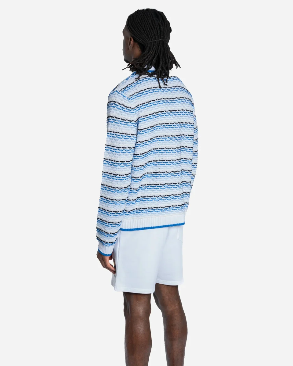 Ce polo à manches longues est réalisé dans un point de tricot texturé orné d’un motif à rayures horizontales dans des nuances de bleu. Il arbore l’écusson logo losange emblématique de la maison sur la poitrine. Le design est complété par un col polo classique, des poignets et un ourlet côtelés avec des détails contrastés sur les bords. La fermeture boutonnée sur le devant est rehaussée par les boutons en nacre à liseré doré signature de la maison. Sa coupe décontractée offre une silhouette moderne tout en conservant une esthétique sportive et soignée.