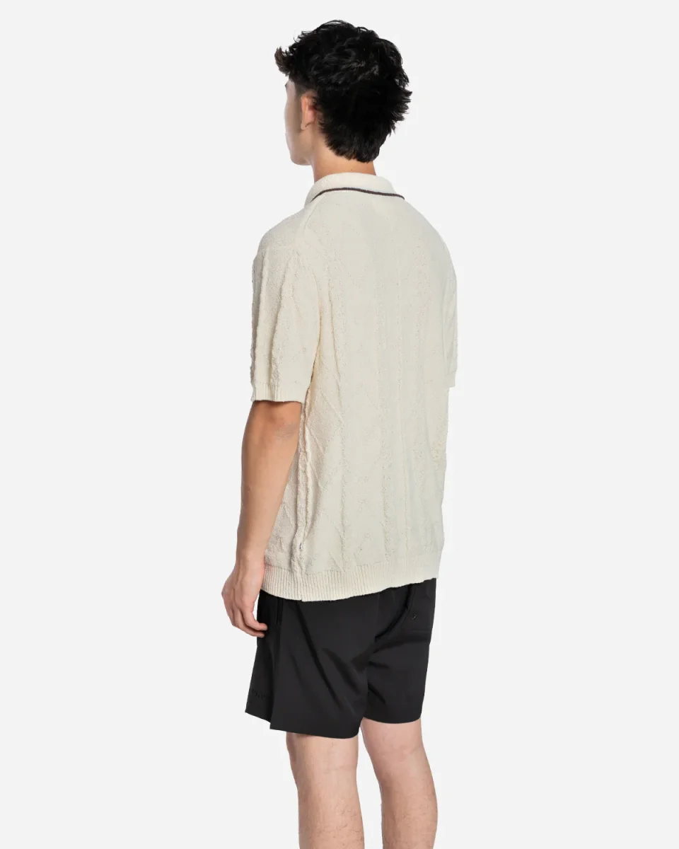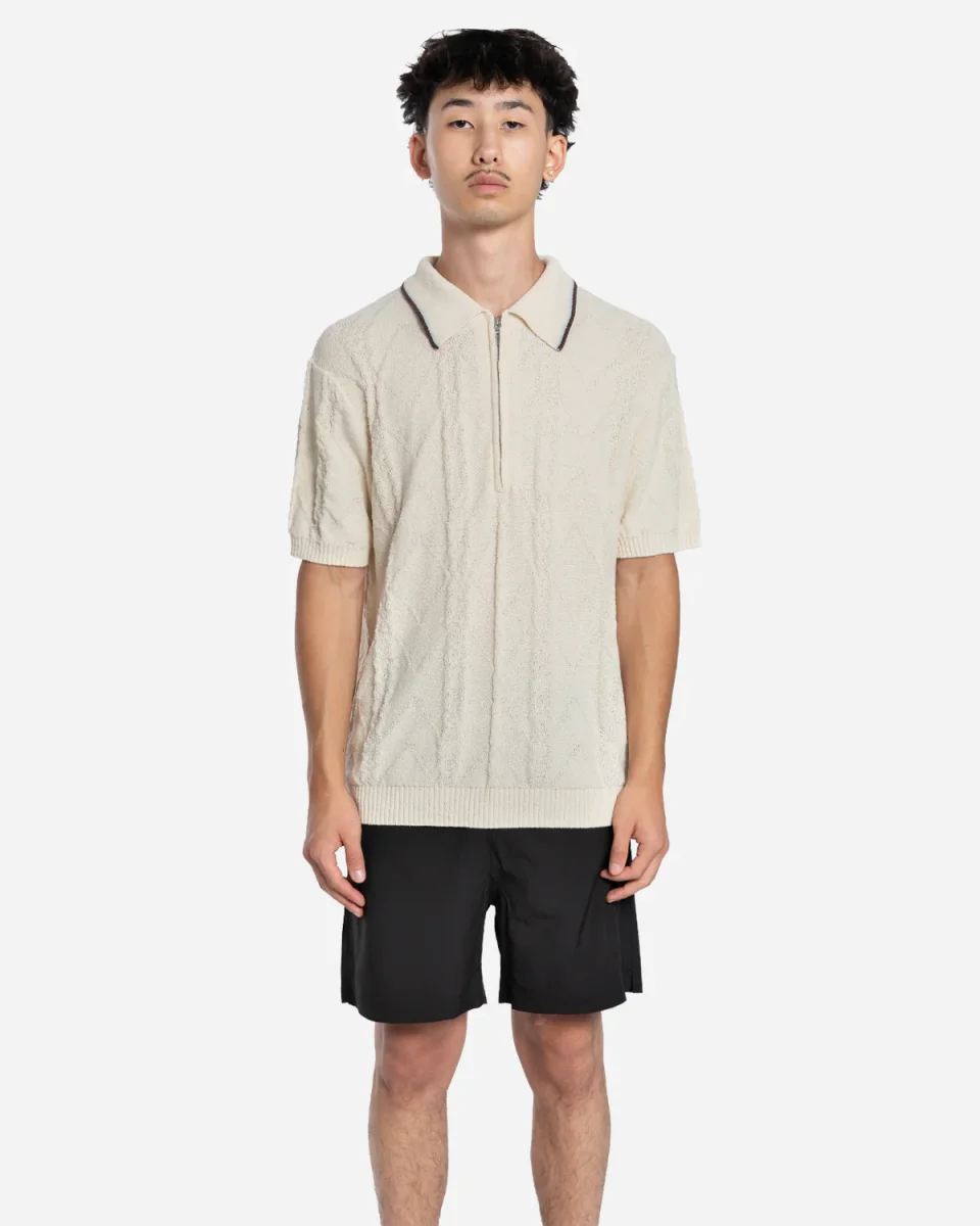 Polo, maille bouclée, coton biologique, motif torsadé, fermeture zippée, rayure contrastante, texture riche, coupe structurée, touche moderne, silhouette classique, look casual, raffiné, confort, style, matière responsable