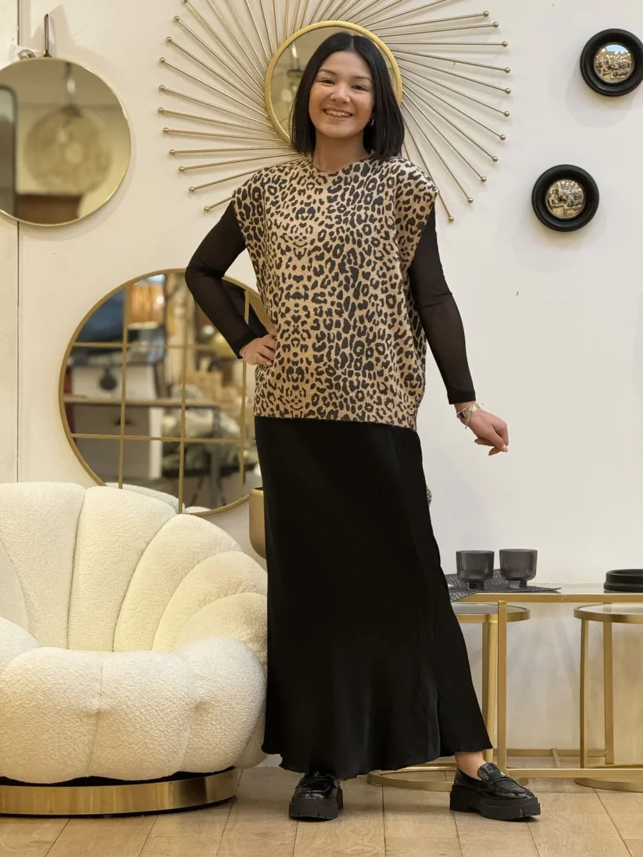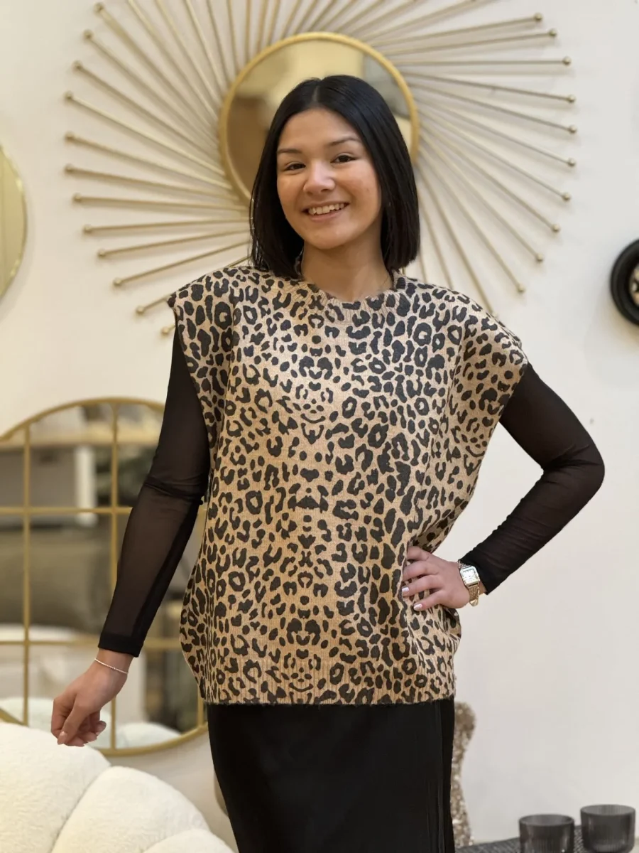 - Pull sans manche col rond imprimé léopard