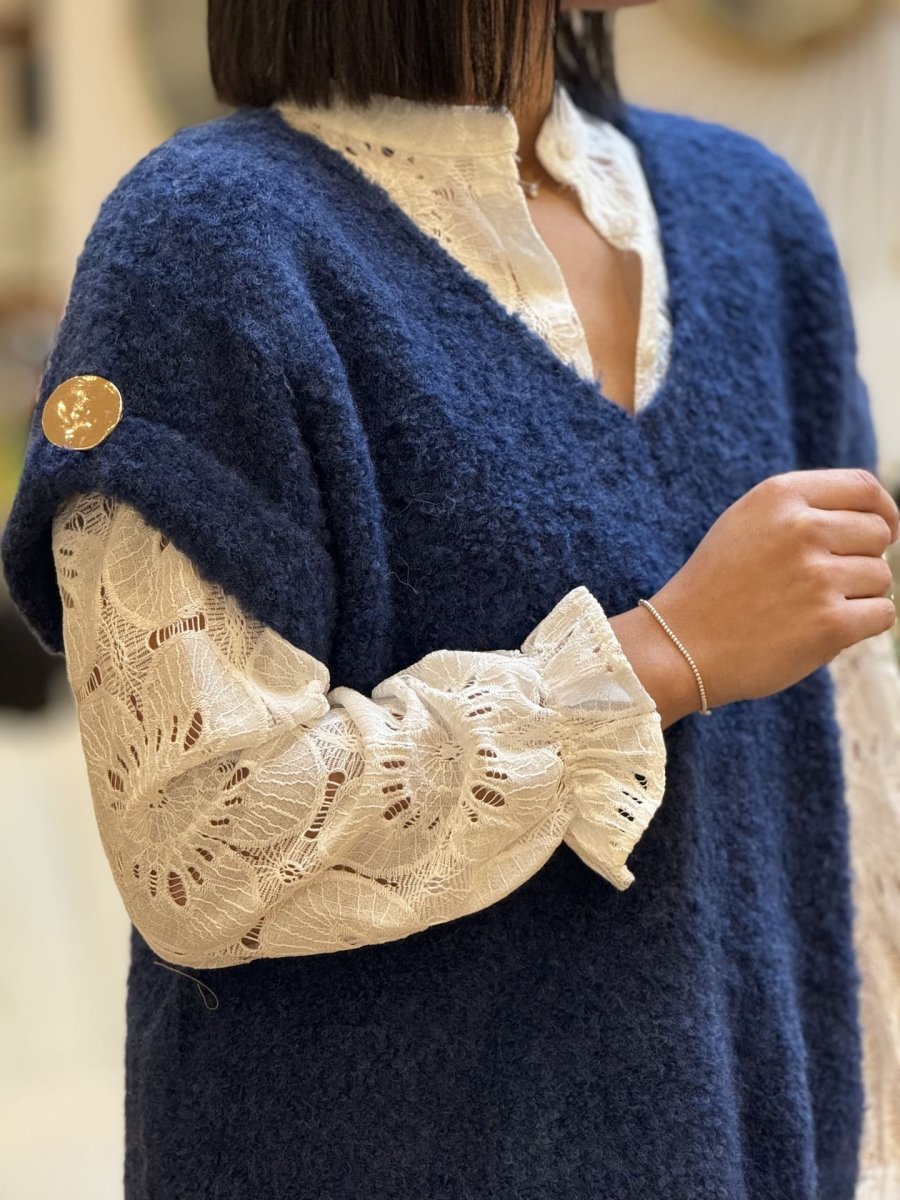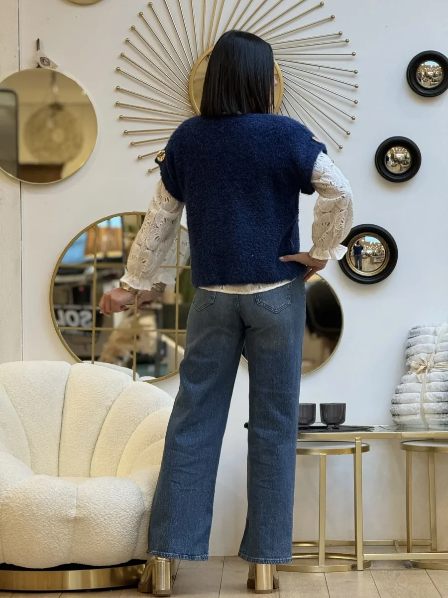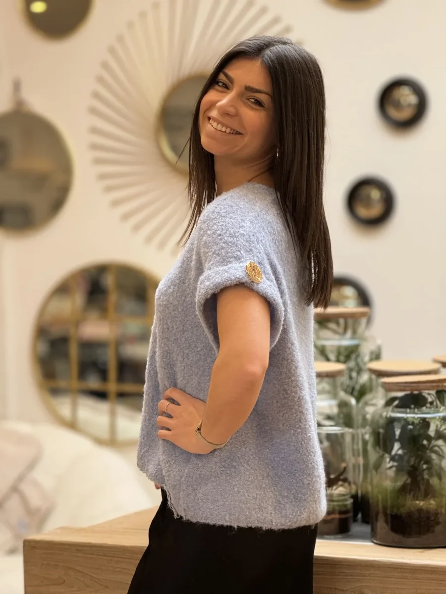 - Pull à mc col V manche courte avec revers et gros bouton doré