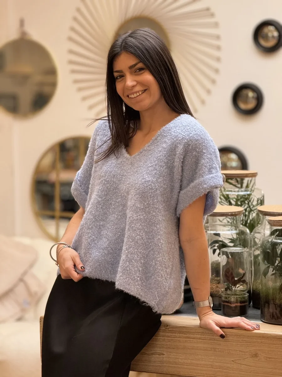 Pull à mc col V manche courte avec revers et gros bouton doré Taille : Mathilde mesure 1m65 et Justine mesure 1m69. Elles portent la taille Taille unique pour ce modèle. Taille : Taille unique Convient de la taille 36 à 42. Composition & entretien : 8% LAINE 19% POLYAMIDE 20% ACRILIQUE 53% POLYESTER RECYCLER […]