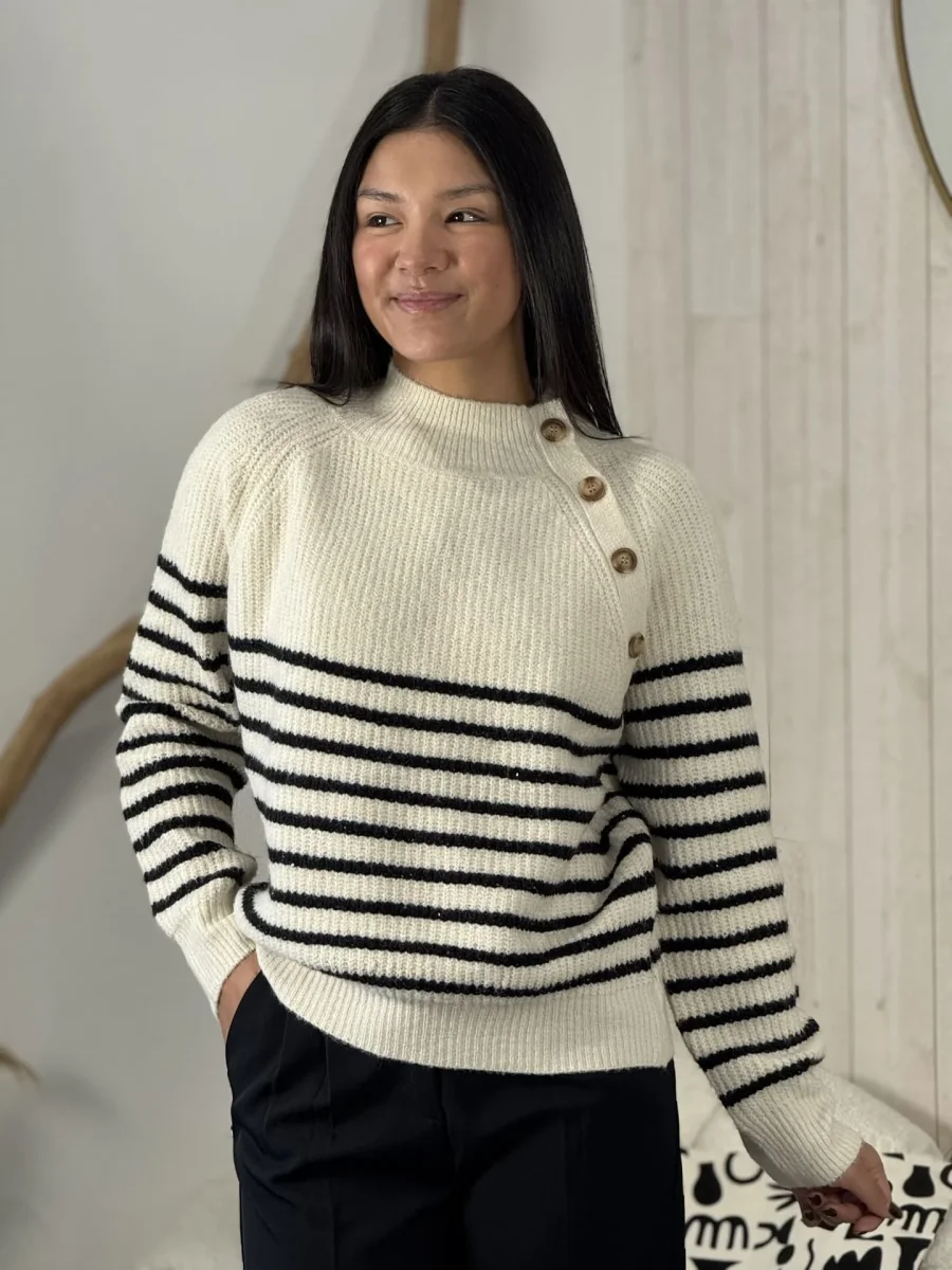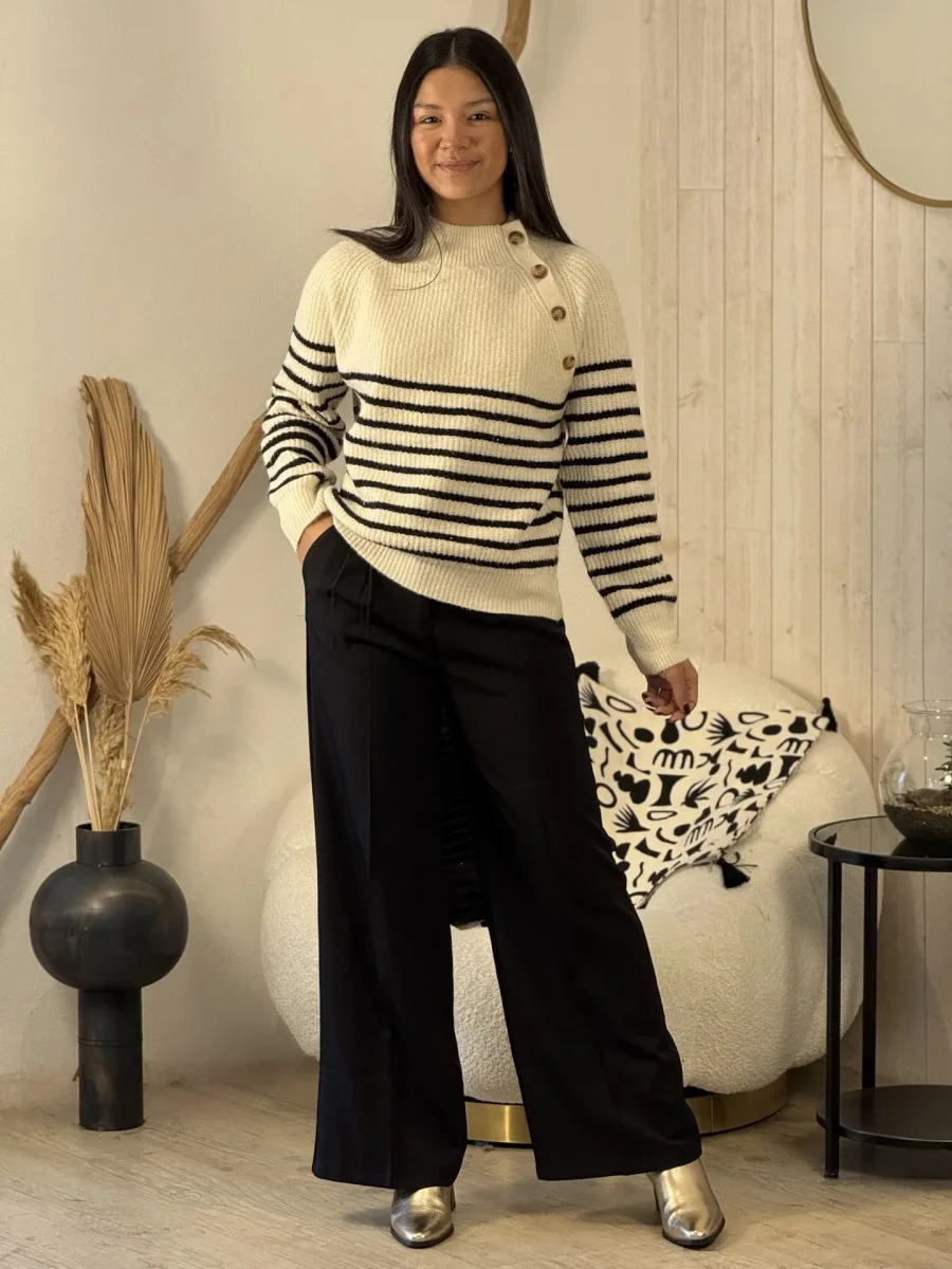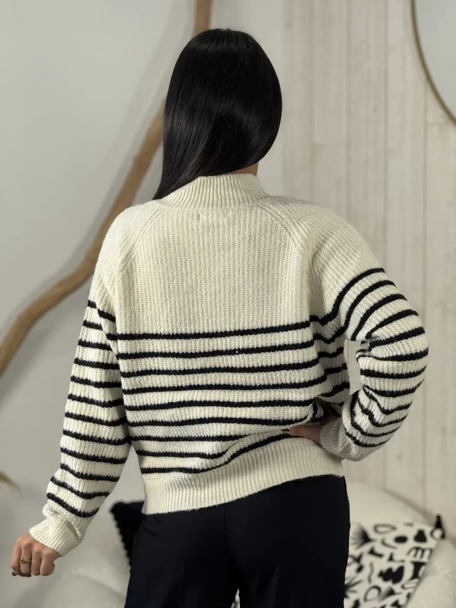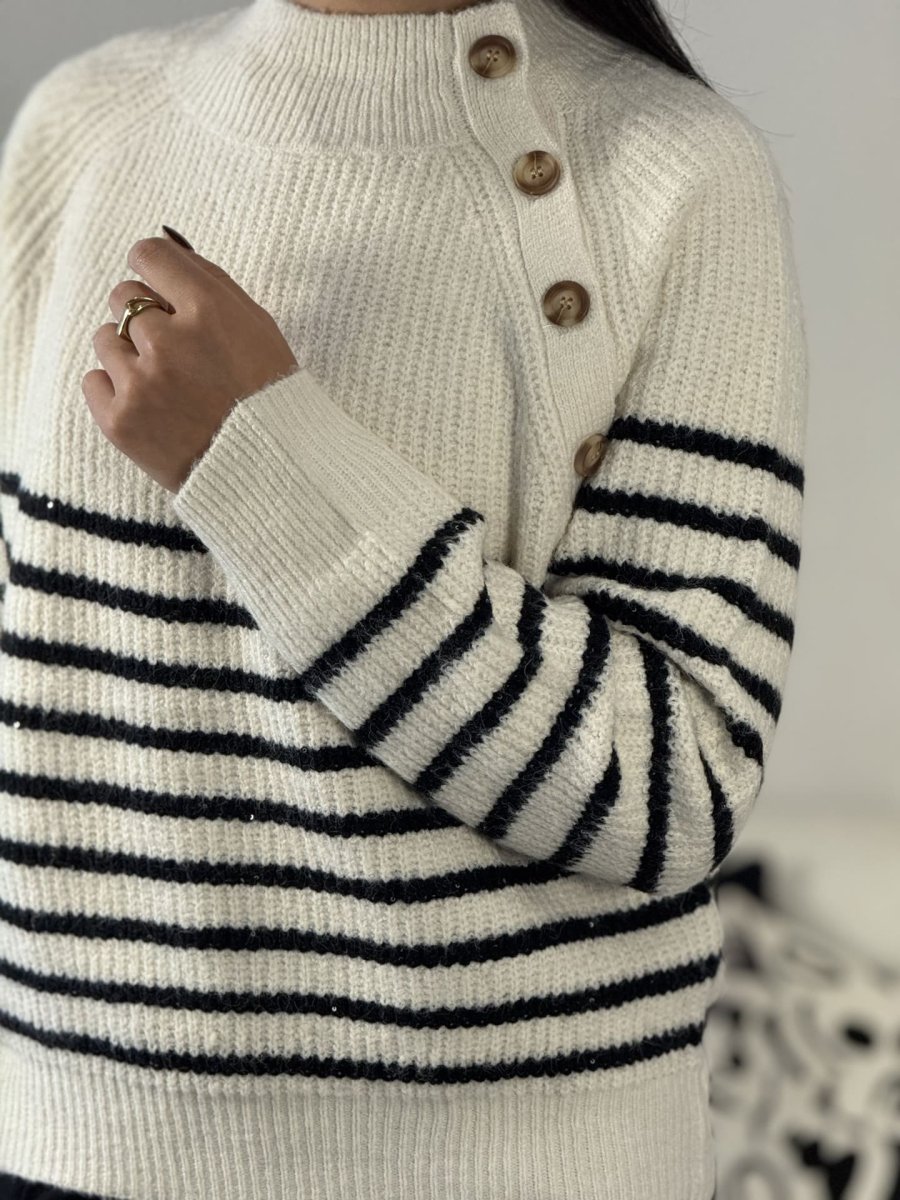 - Pull à ml col haut rond avec boutons sur côté imprimé marinière