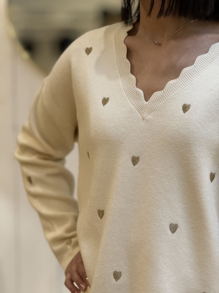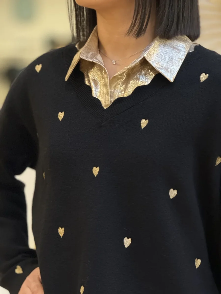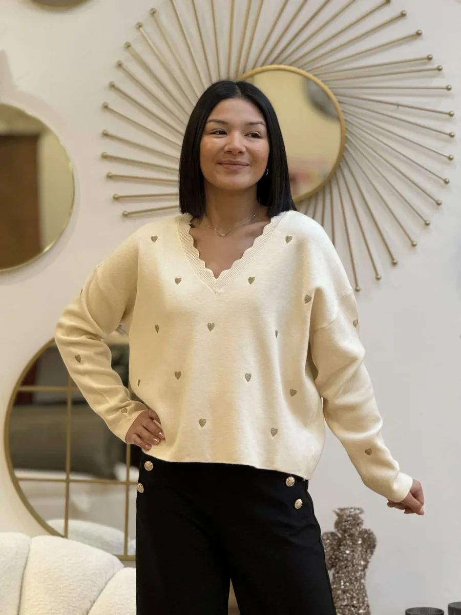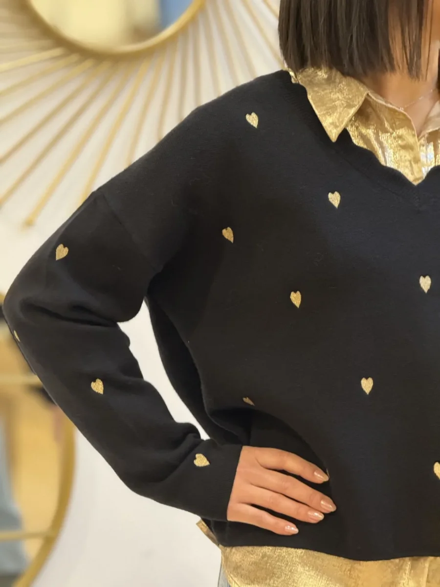 - PULL à ml col v a vague imprimé cœur doré