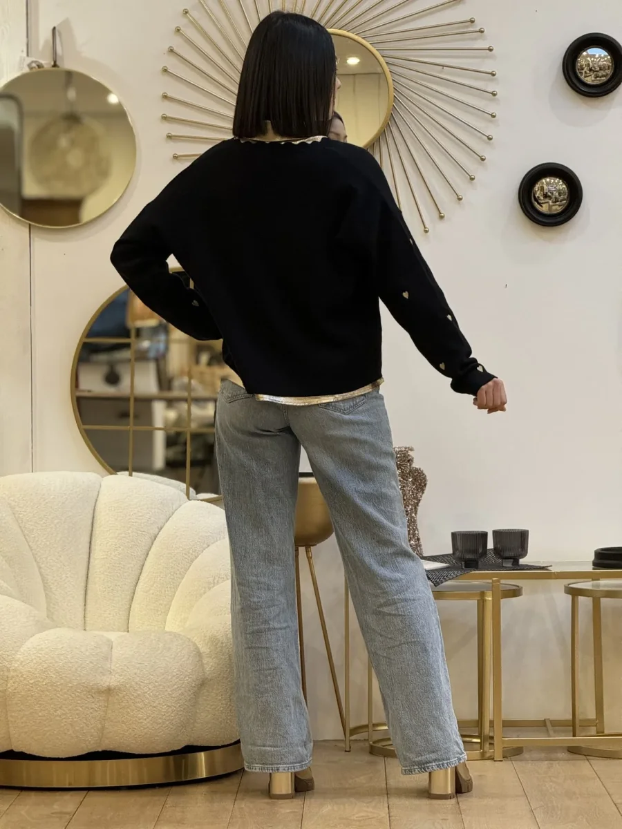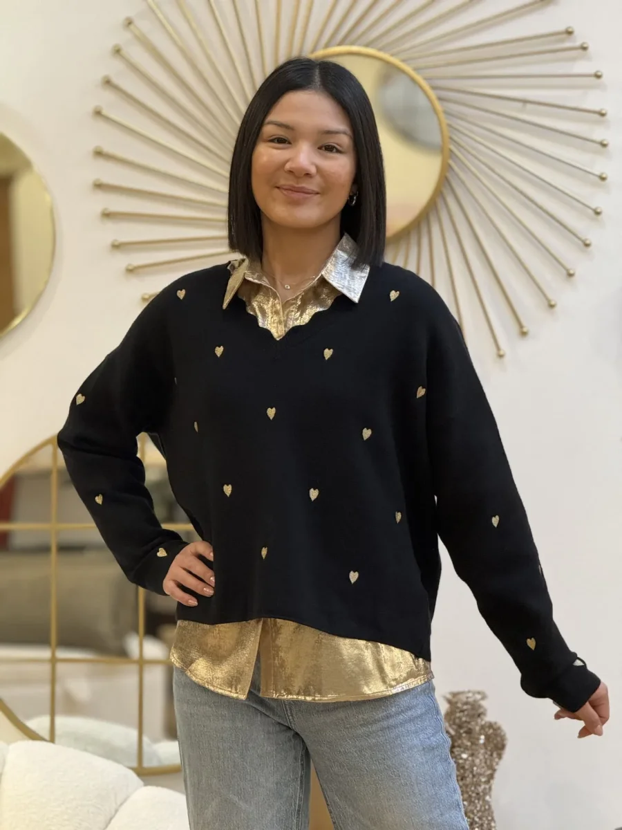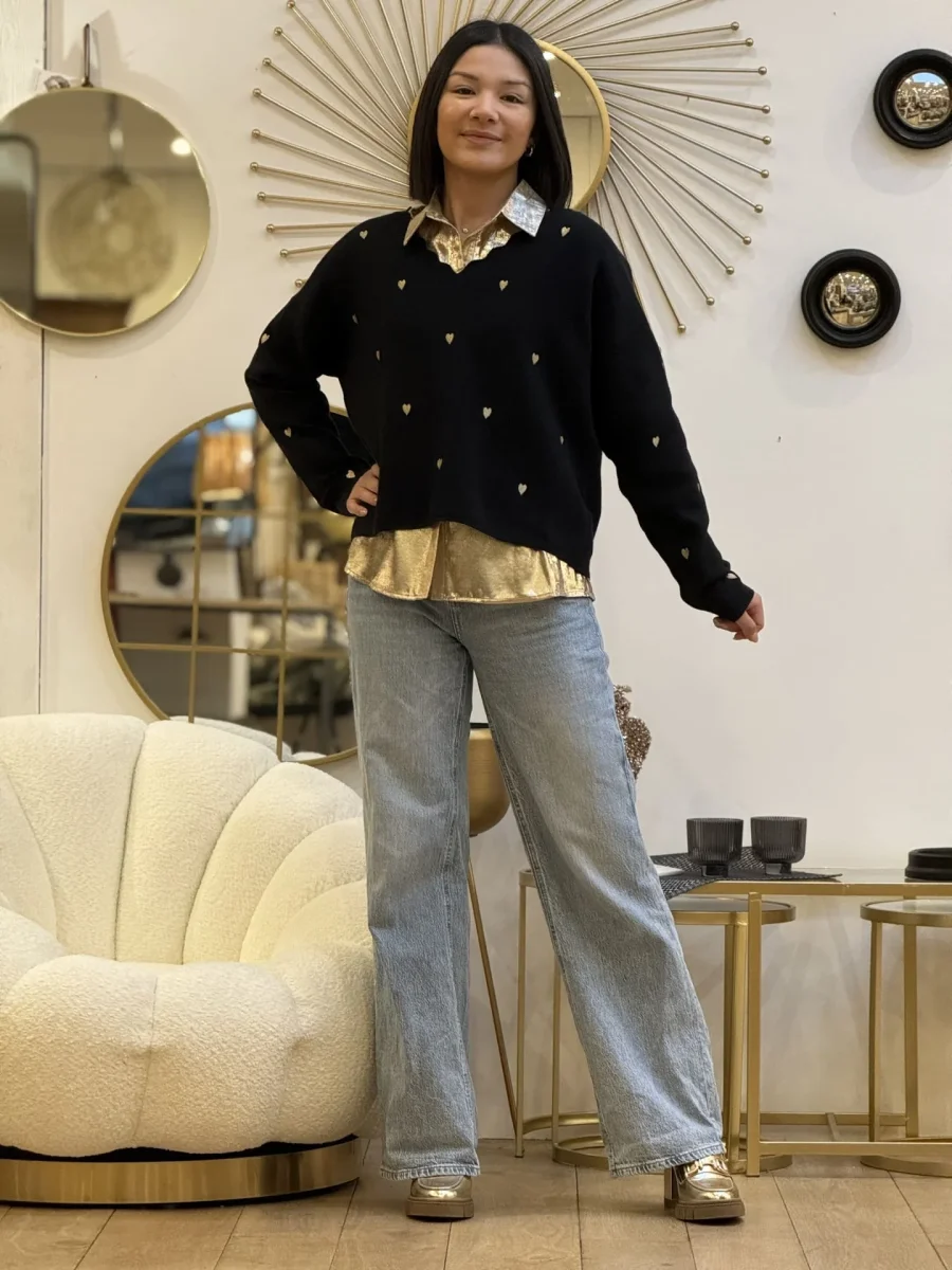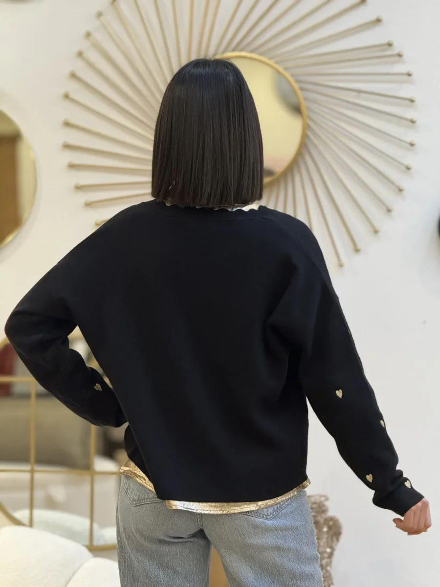 - PULL à ml col v a vague imprimé cœur doré