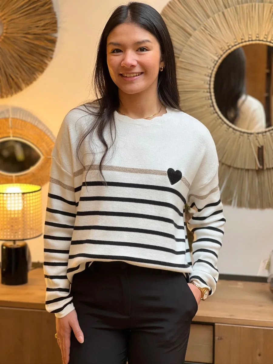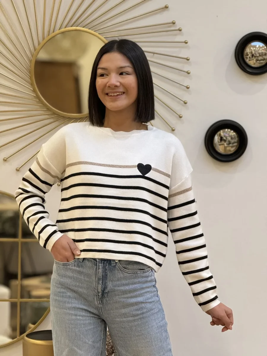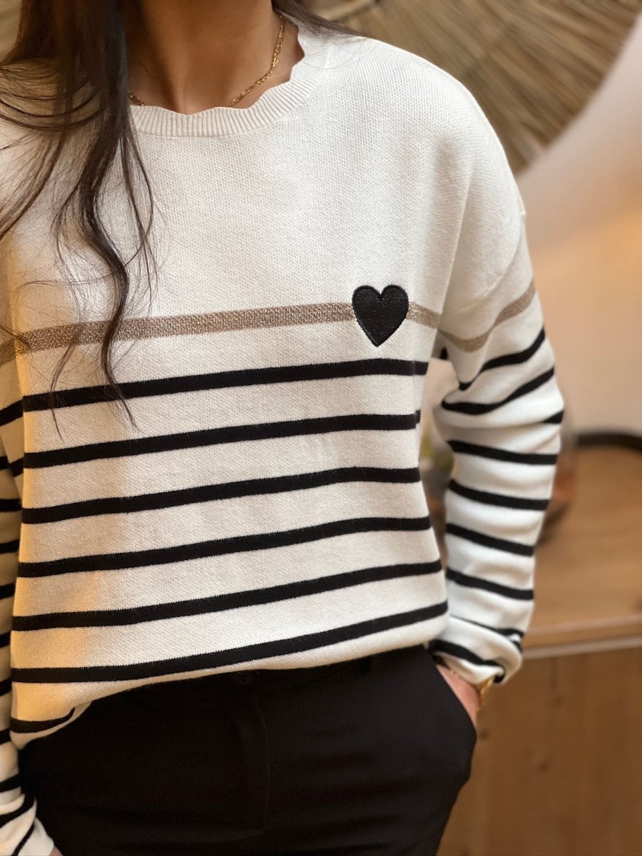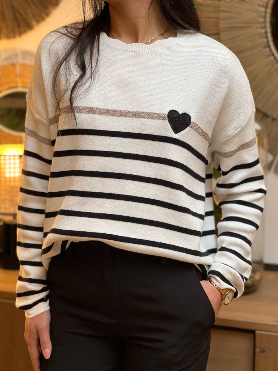 - Pull à ml col rond torsadé marinière + cœur sur poitrine