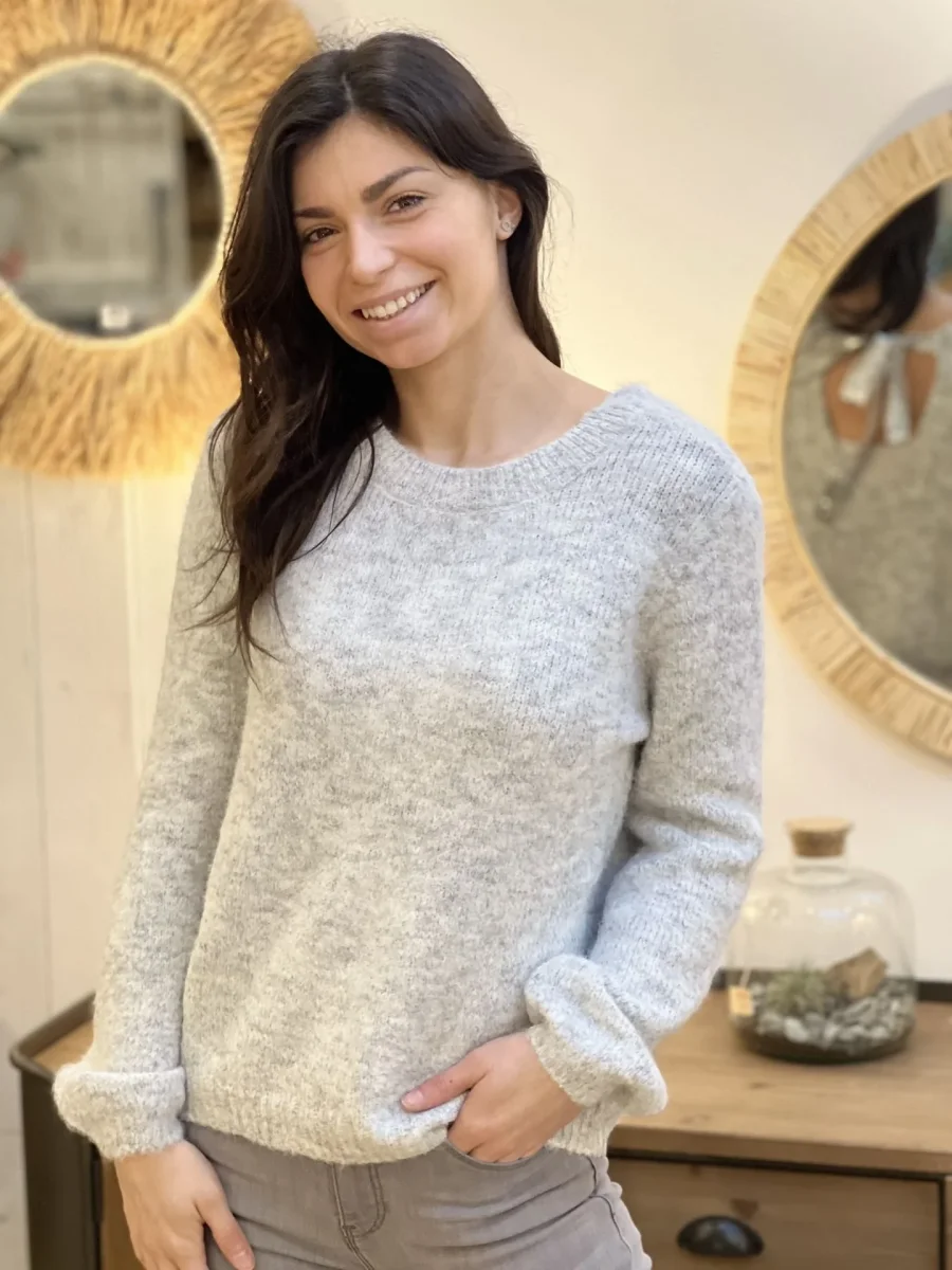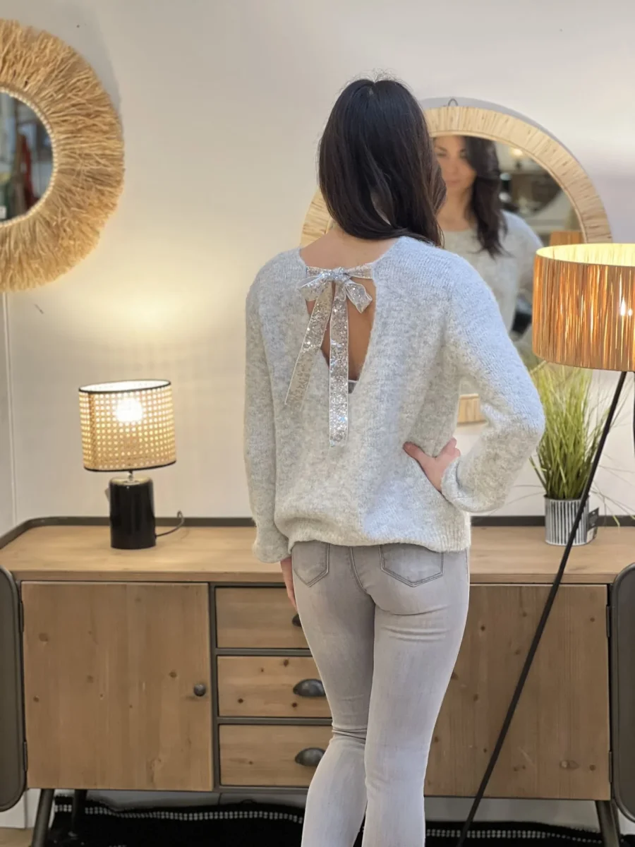 - Pull à ml uni col rond ouvert dans le dos avec nœud