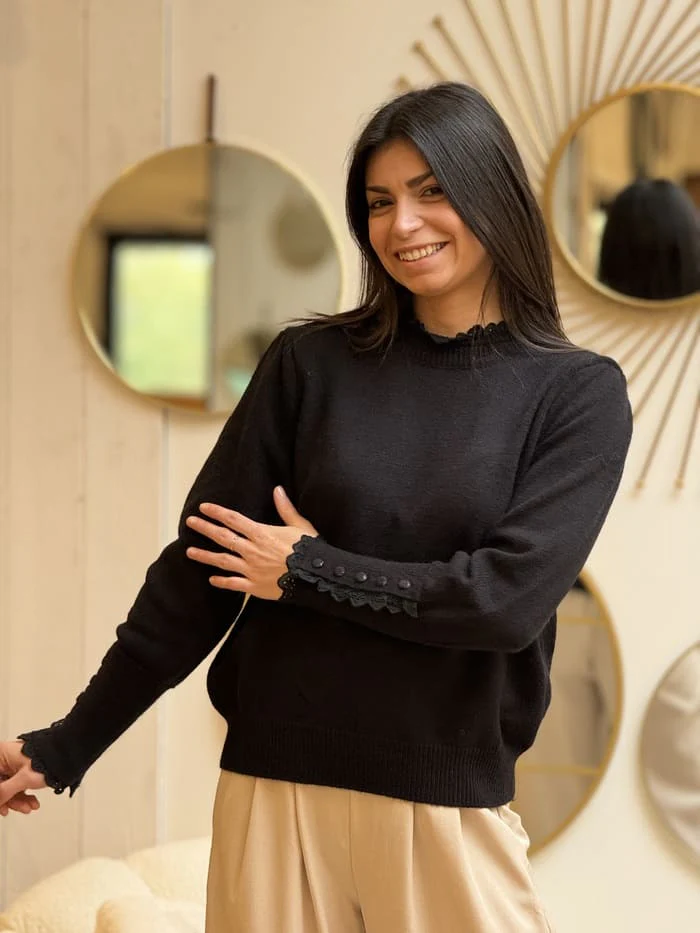- Pull à ml col haut froufrou avec boutons aux manches + dentelle