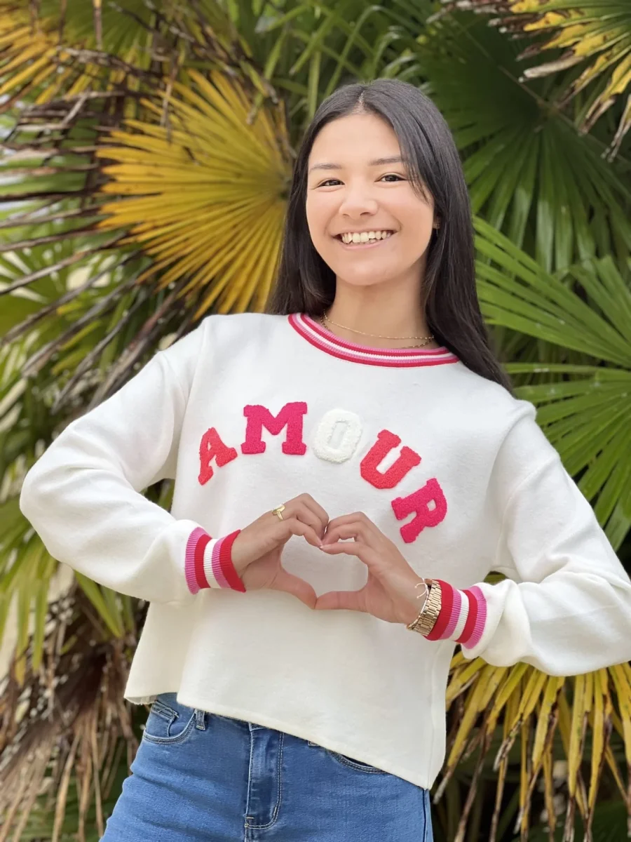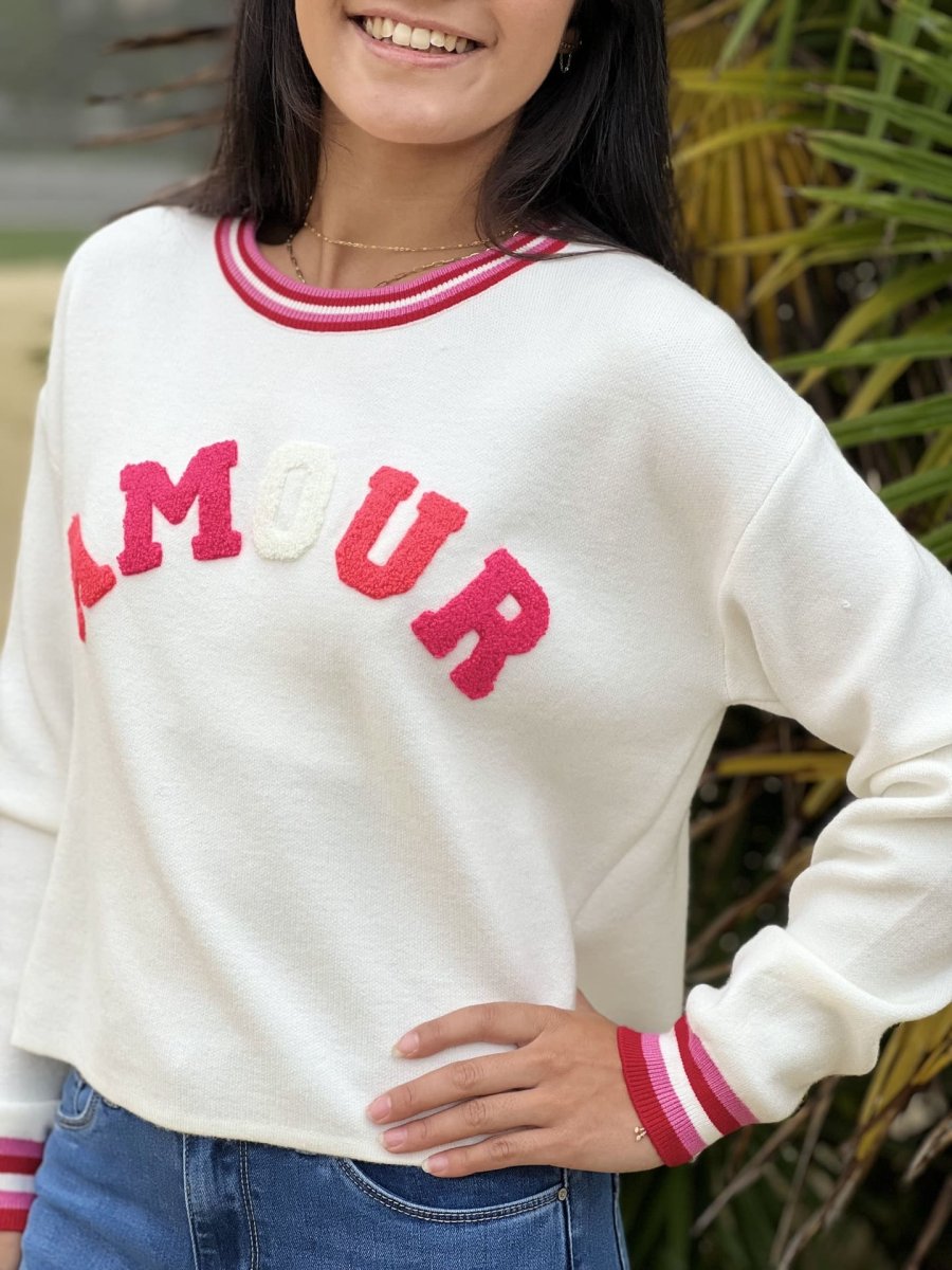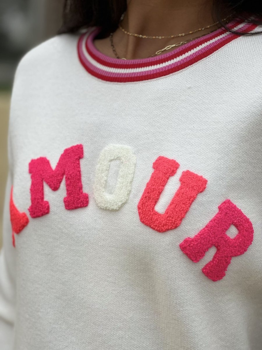 • Pull à ml col rond inscription AMOUR en bleu roi + bout de manches