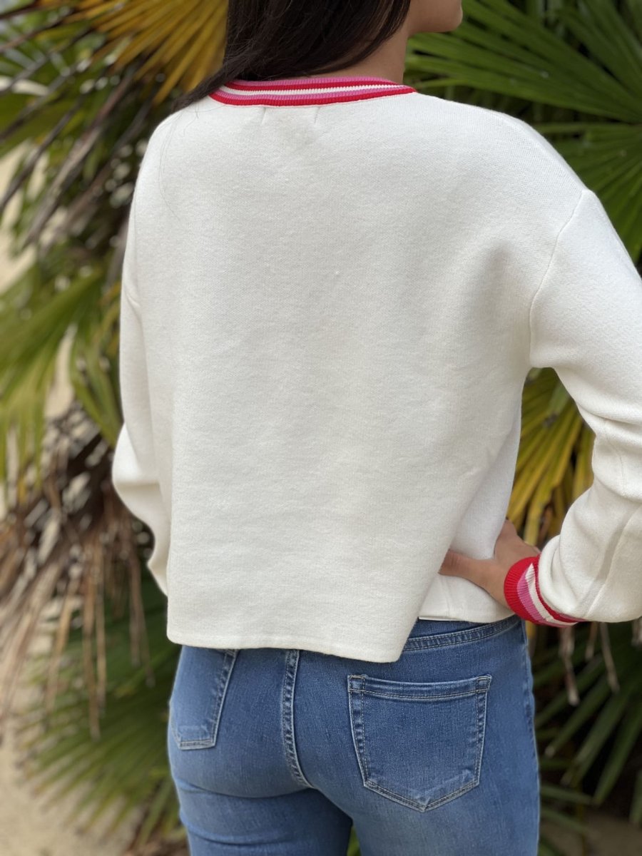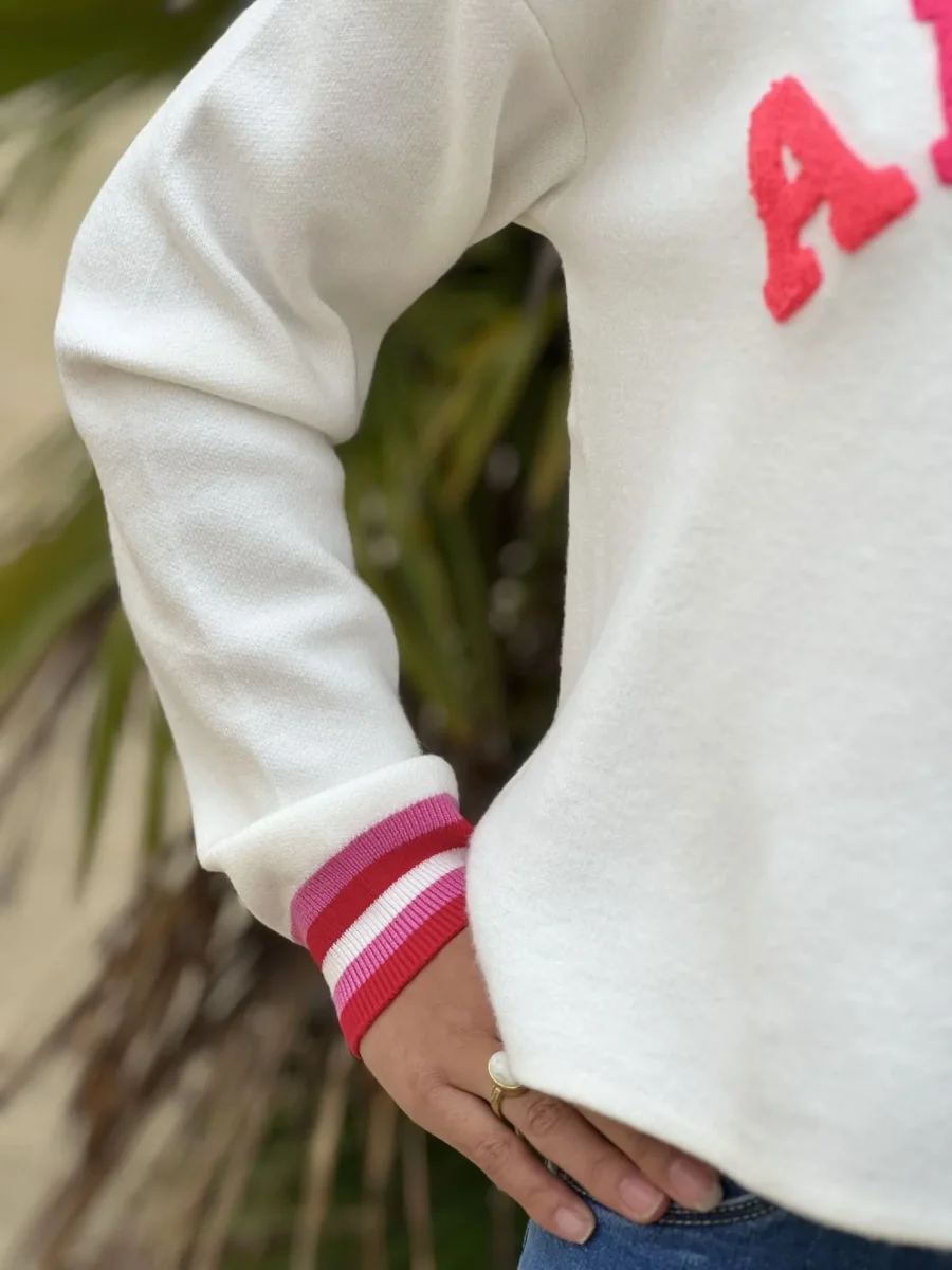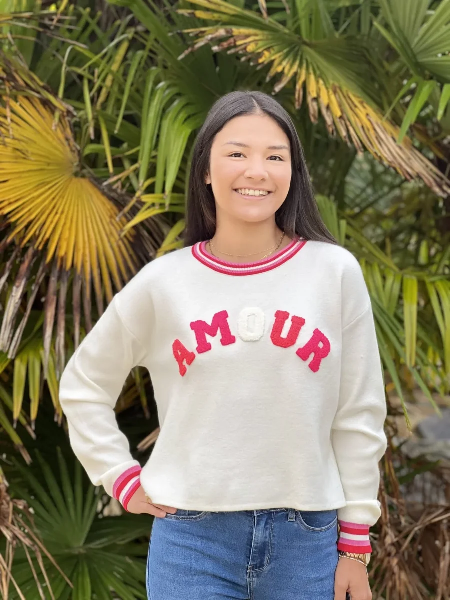 • Pull à ml col rond inscription AMOUR en bleu roi + bout de manches