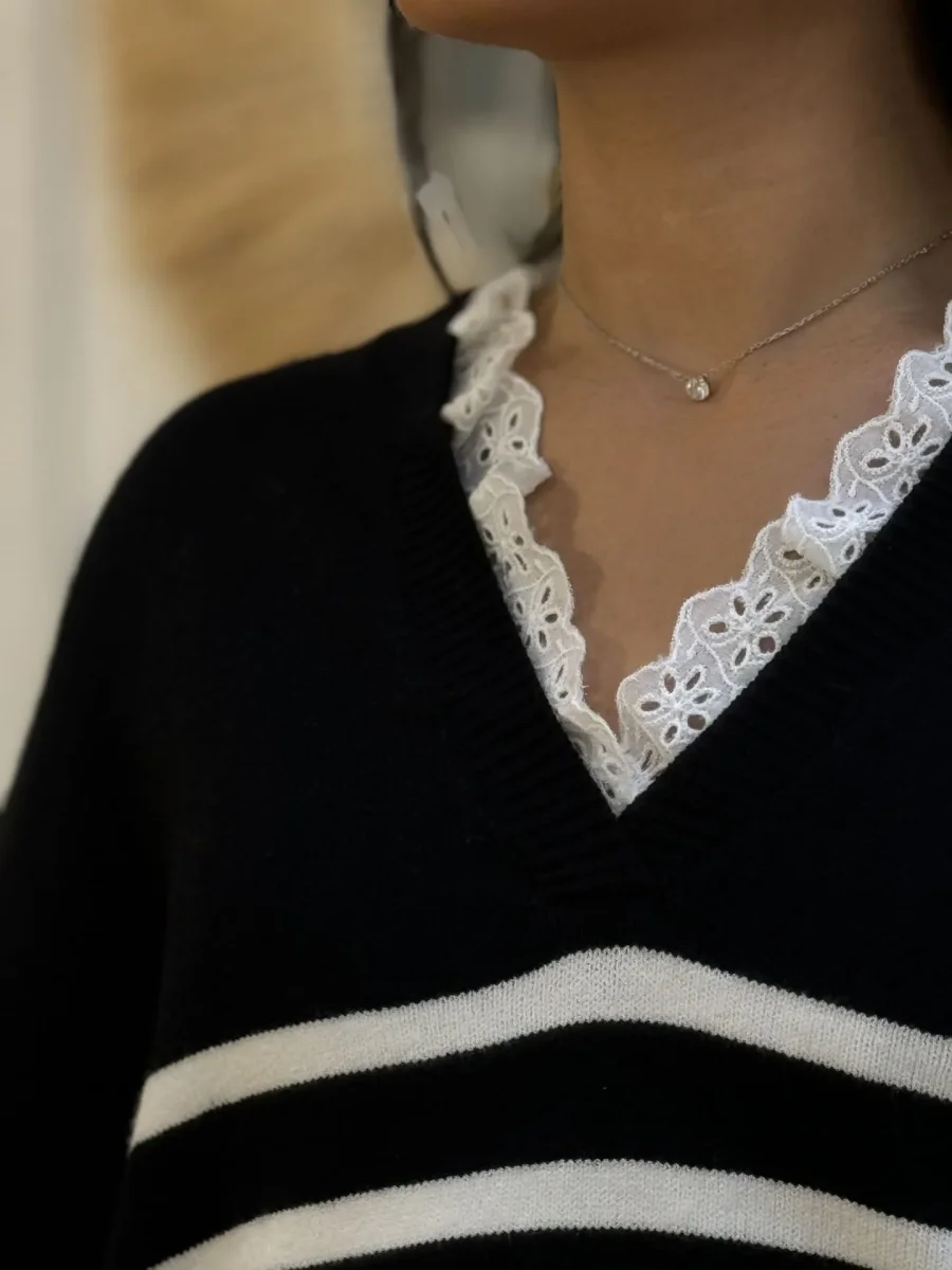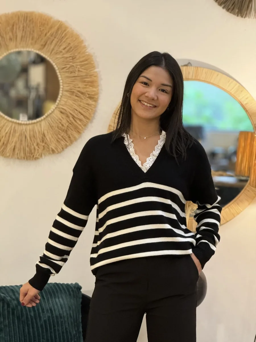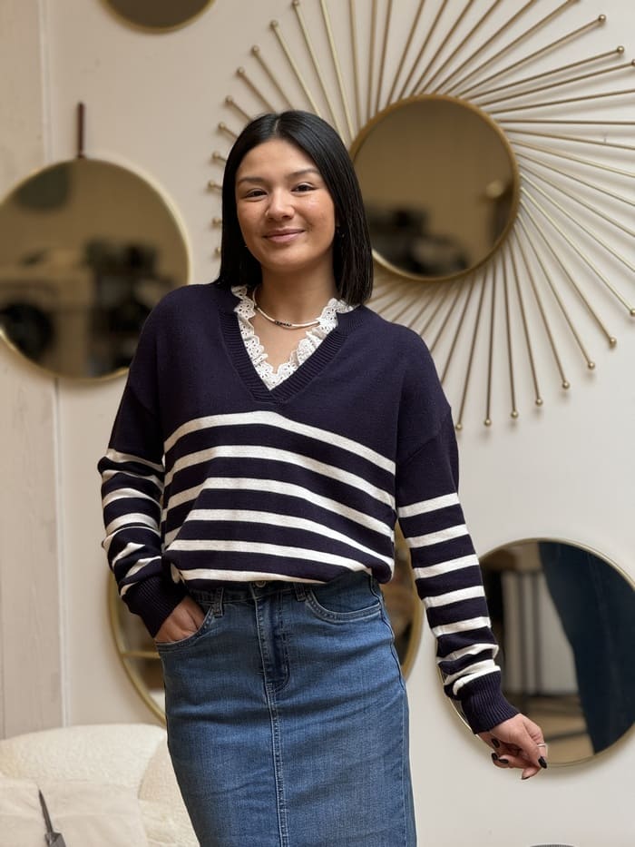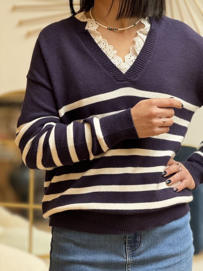 - PULL À ML COL V DENTELLE – IMPRIMÉ MARINIÈRE