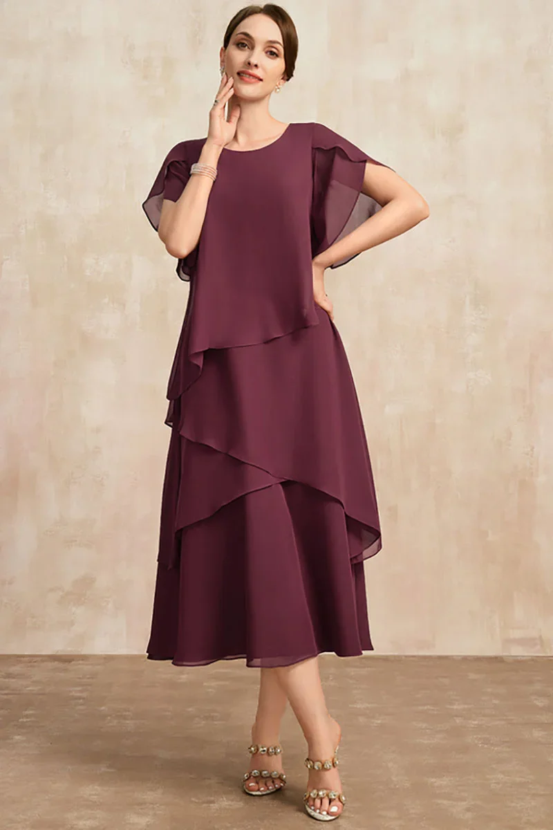 Apportez une touche de grâce et de distinction à votre tenue avec cette robe de belle-mère pour mariage. Conçue pour vous offrir un confort optimal tout en mettant en valeur votre élégance naturelle, cette robe se distingue par sa coupe fluide à superpositions asymétriques, ses manches papillon légères et sa teinte prune profonde, parfaite pour les grandes occasions. Un choix idéal pour accompagner les mariés avec prestance et discrétion.