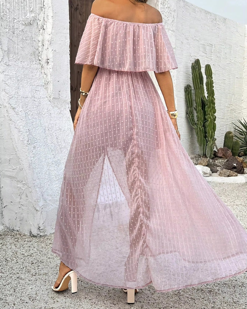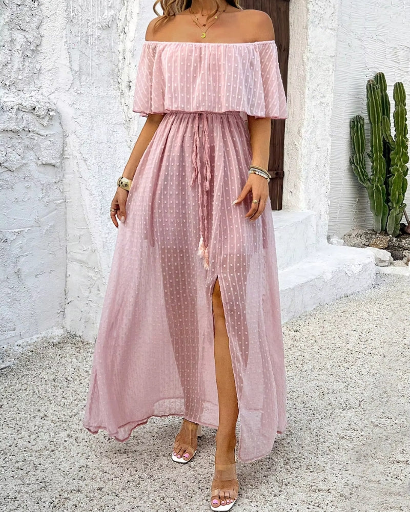 Cette création unique met en avant des épaules dénudées qui captent le regard, agrémentées de manches courtes ajoutant un charme subtil. La fente avant offre une liberté de mouvement, tout en mettant en valeur vos jambes. Enfin, sa taille cintrée avec cordon ajustable assure un ajustement parfait, pour une silhouette impeccable en toute occasion.