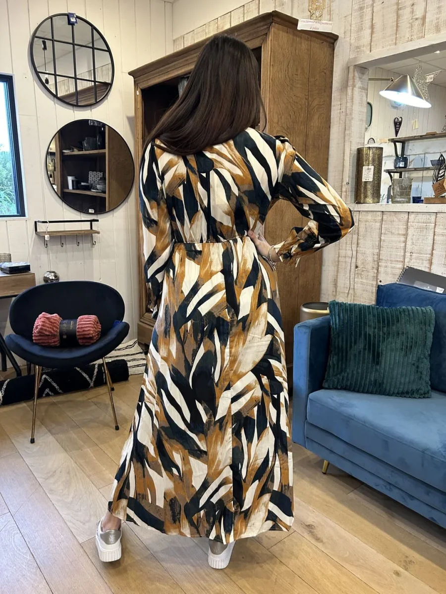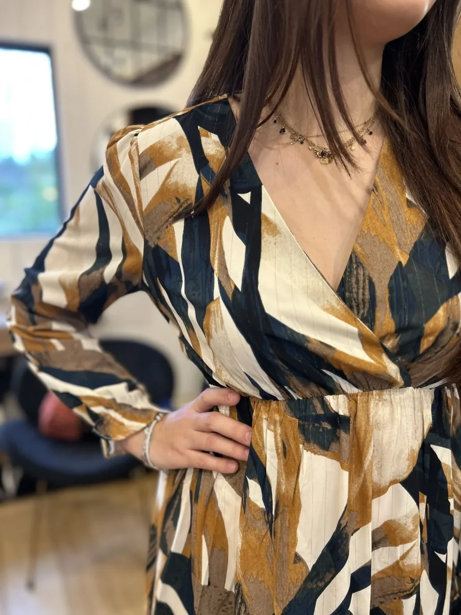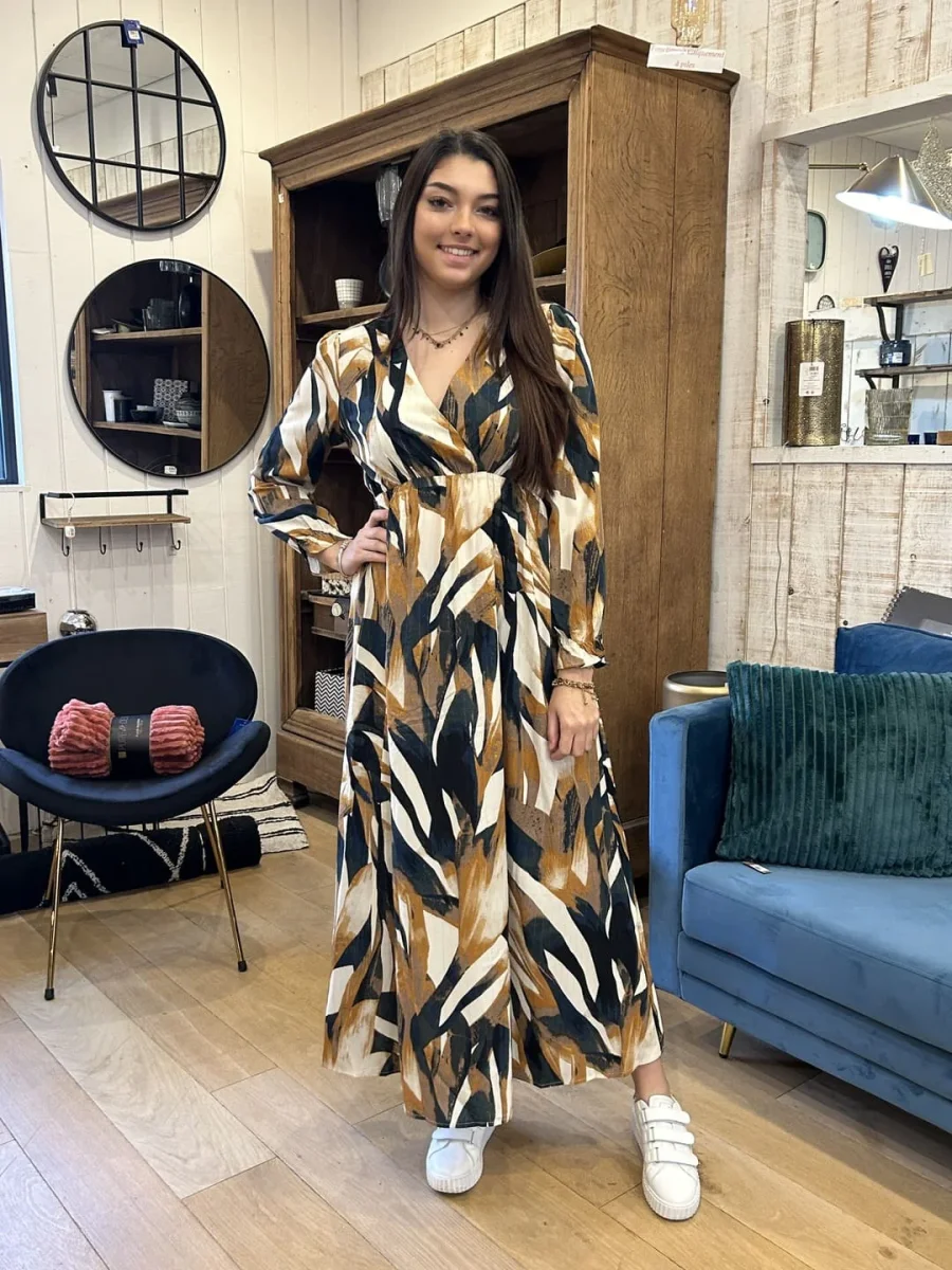- Robe longue à ml col cache cœur imprimé tâches/feuilles jaune