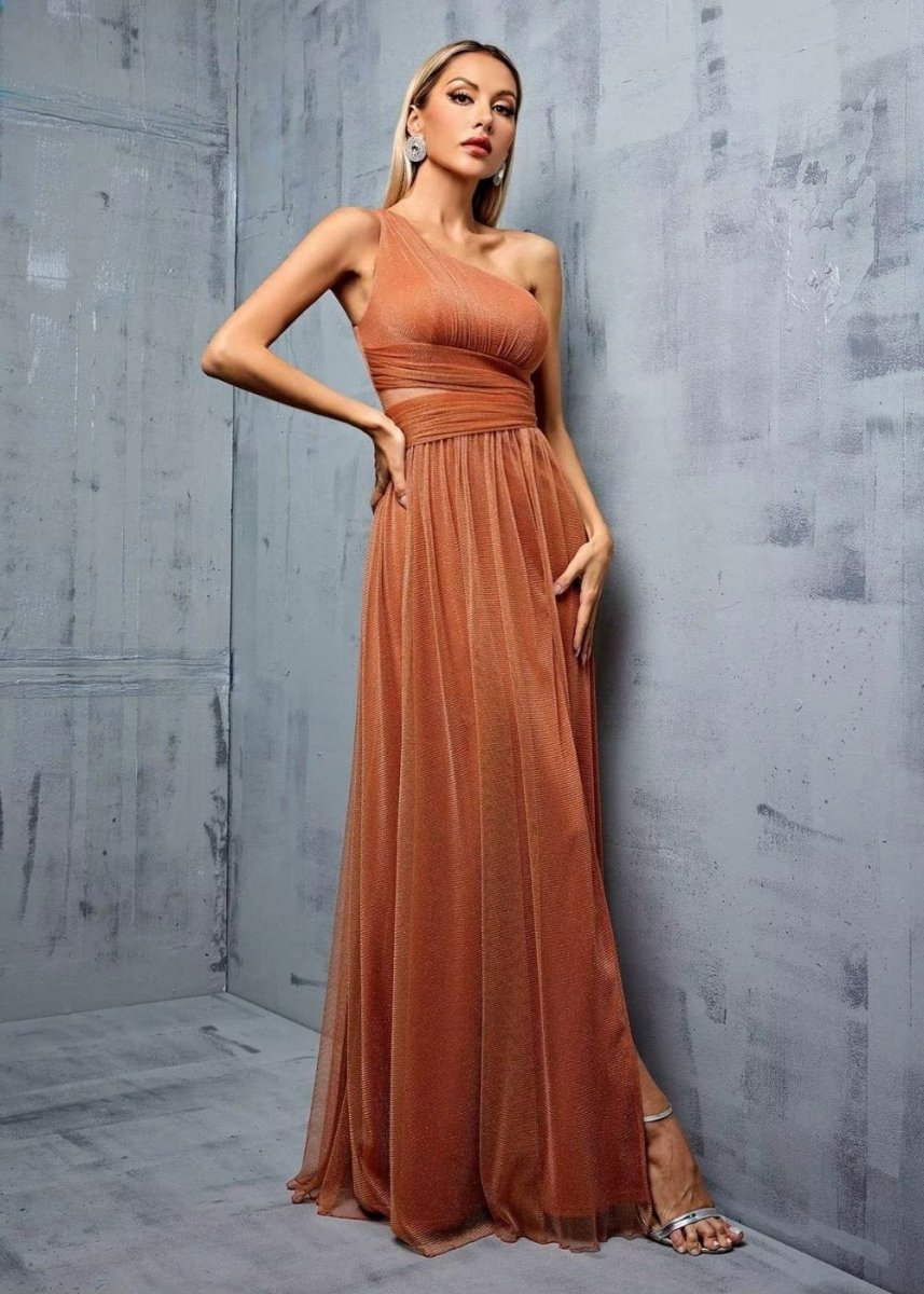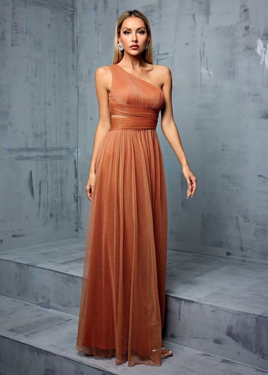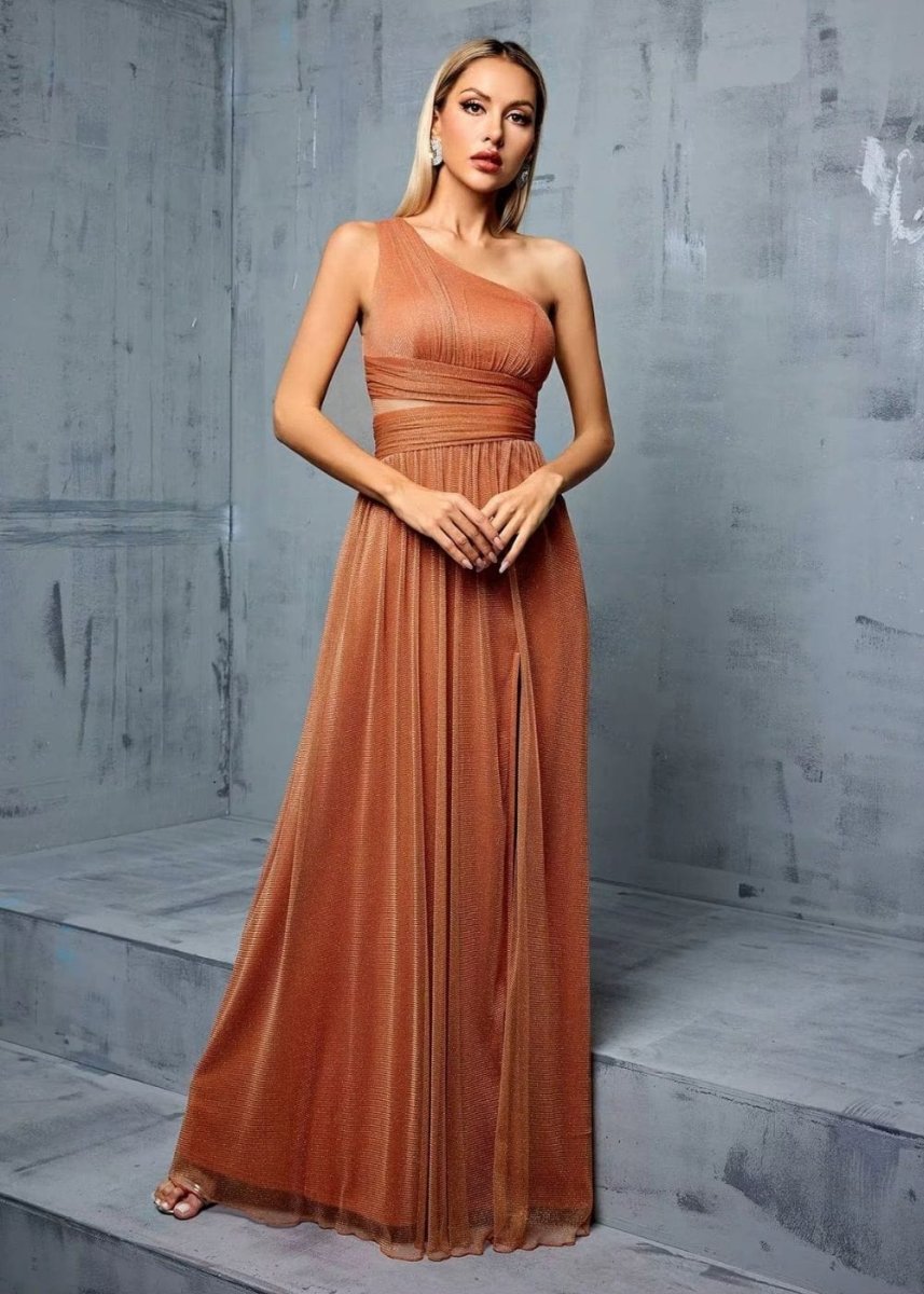 Cette robe de cérémonie couleur terracotta est une véritable invitation à l’élégance. Avec son délicat jeu d’asymétrie, elle met en valeur ton épaule avec raffinement tout en sculptant ta silhouette grâce à son cintrage subtil. Son tissu fluide et scintillant capte la lumière à chaque mouvement, t’offrant une allure à la fois gracieuse et moderne. La fente latérale ajoute une touche de sensualité discrète, parfaite pour une entrée remarquée.