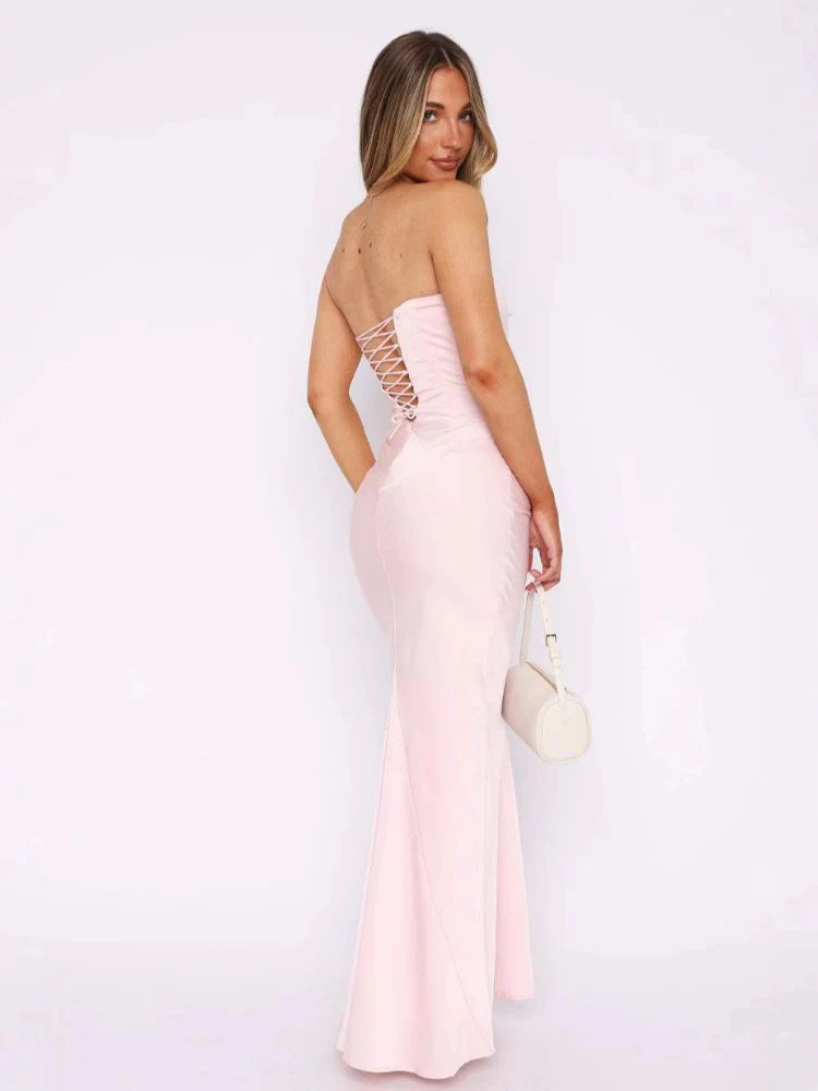 Robe longue rose poudré bustier, silhouette glamour et raffinée